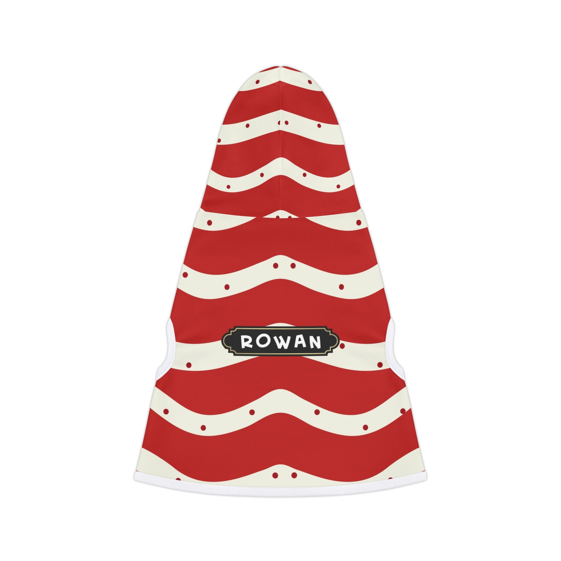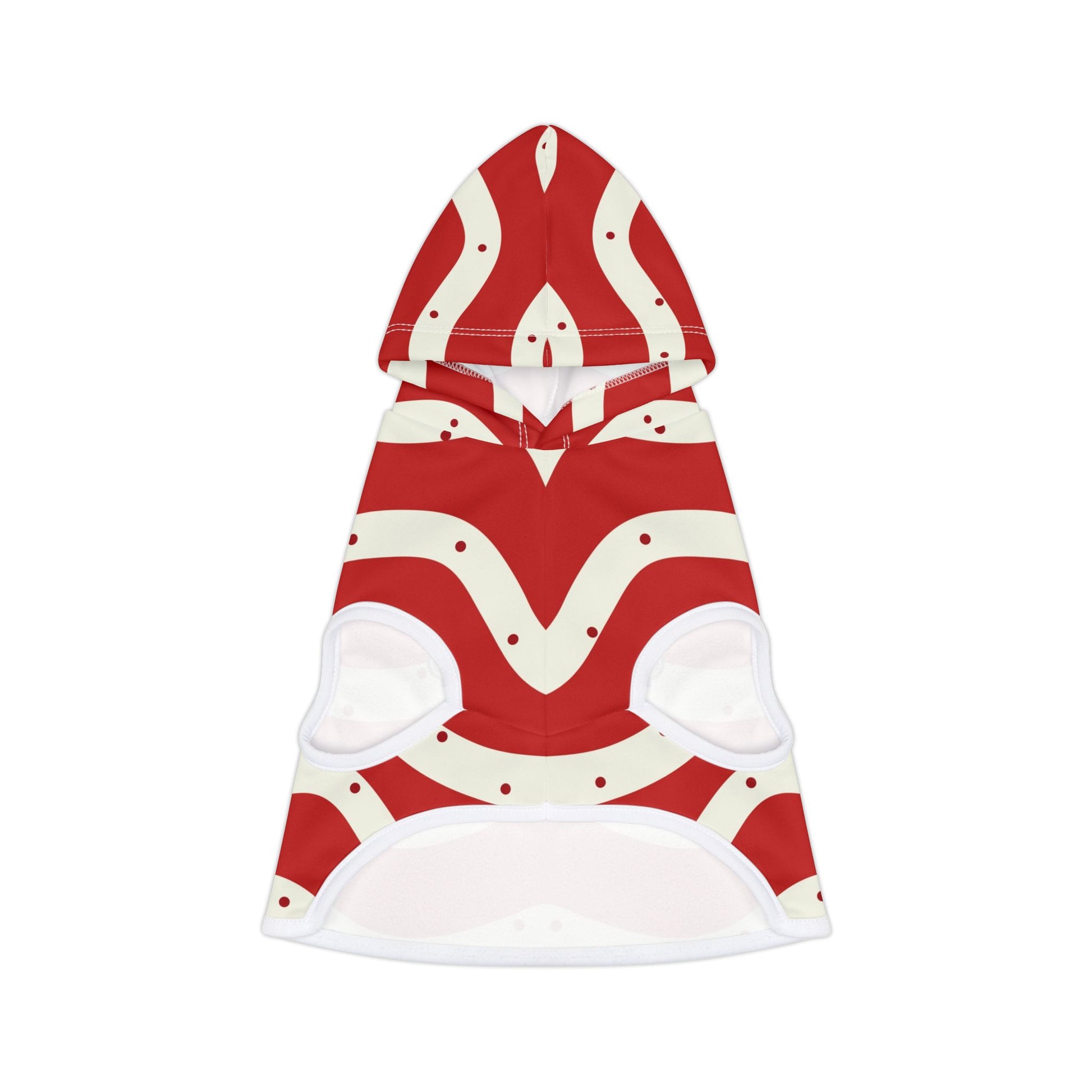 This cozy pet hoodie brings warmth and personality to chilly walks and quiet nights at home. Soft, stretchy polyester hugs your pup’s shape while a bold red-and-cream wave pattern adds a playful, vintage feel. The hood sits neatly without slipping, and the curved cut at the belly keeps movement easy. Thoughtful details — like the stitched name label and clean folded edge — make it feel handmade and personal. Slip it on for neighborhood strolls, rainy-day snuggles, or holiday photos that capture their goofy, lovable spirit.