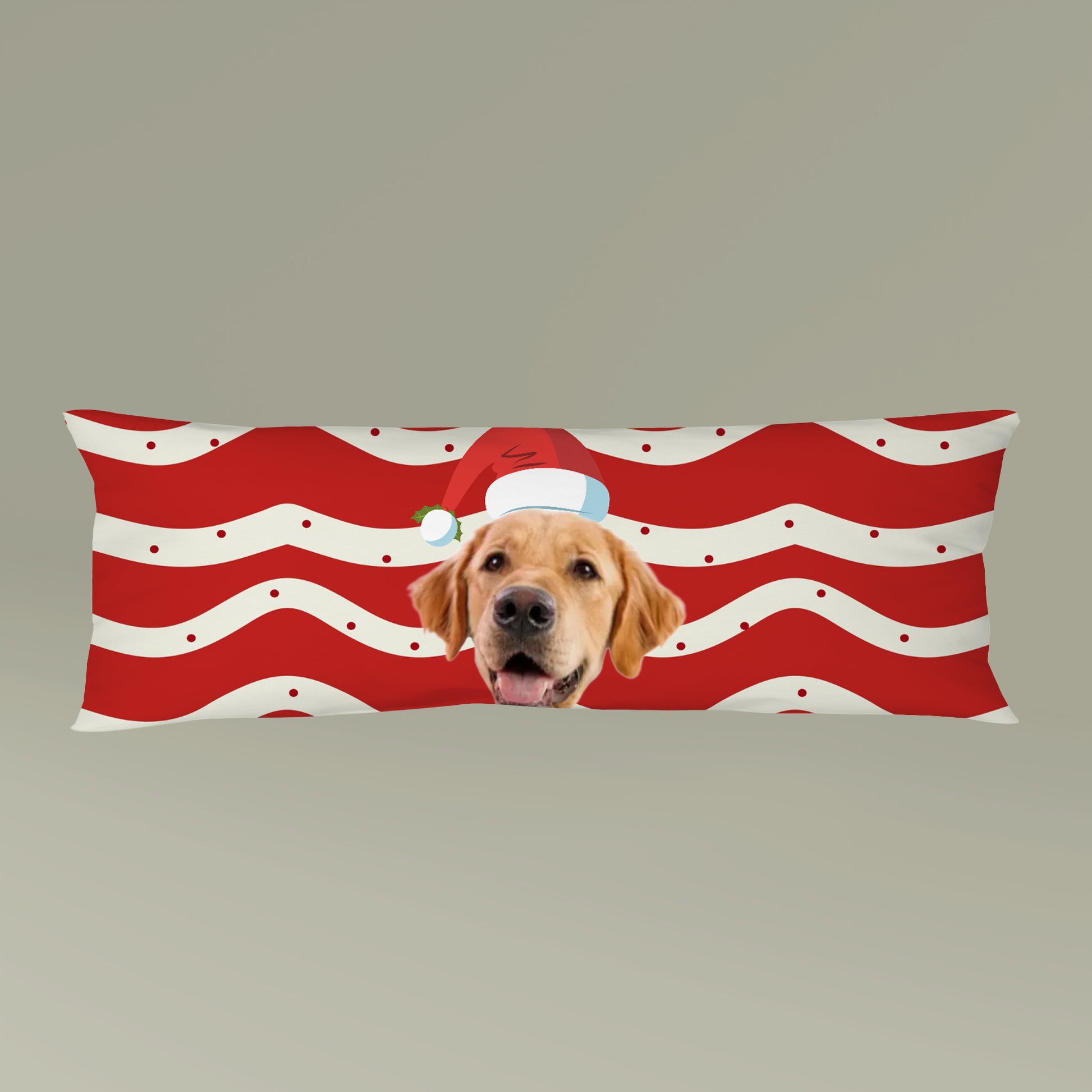 Wrap yourself in cozy, playful comfort with this long body pillow featuring a cheerful golden retriever wearing a sailor hat set against wavy red-and-cream stripes. Designed to feel like a gentle companion on slow mornings or late-night movie marathons, the plush polyester cover has a soft, tactile nap that invites you to rest your head, hug, or prop your legs. The design appears on both sides so the jaunty pup greets you no matter how you arrange the pillow, and a hidden zipper keeps the silhouette clean while letting you remove the cover for washing. Sized for full-body support, this pillow blends practical comfort with a lighthearted, nautical vibe that brightens any couch, bed, or reading nook.