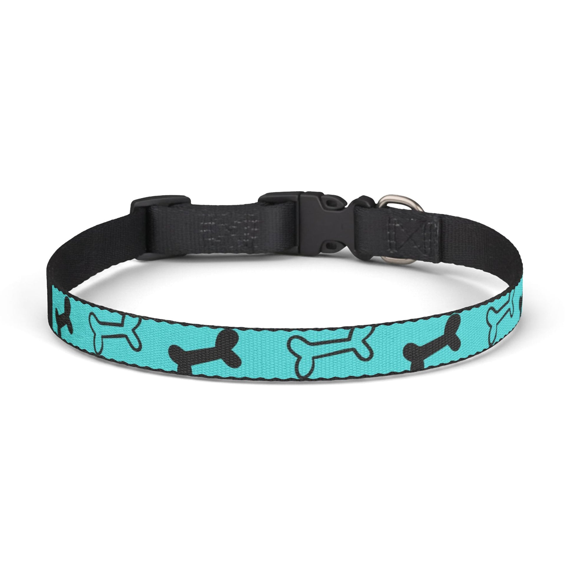 Lightweight, durable clip-on collar designed for everyday walks and playful afternoons. The bold turquoise band with playful bone silhouettes adds a cheerful pop of color while the heavy-duty nylon webbing and polyester face resist stretching and wear. A secure side-release buckle and metal D-ring keep tags and leashes in place without fuss. Comes in three sizes so small and medium pups can wear the same lively look and feel comfortable all day long.