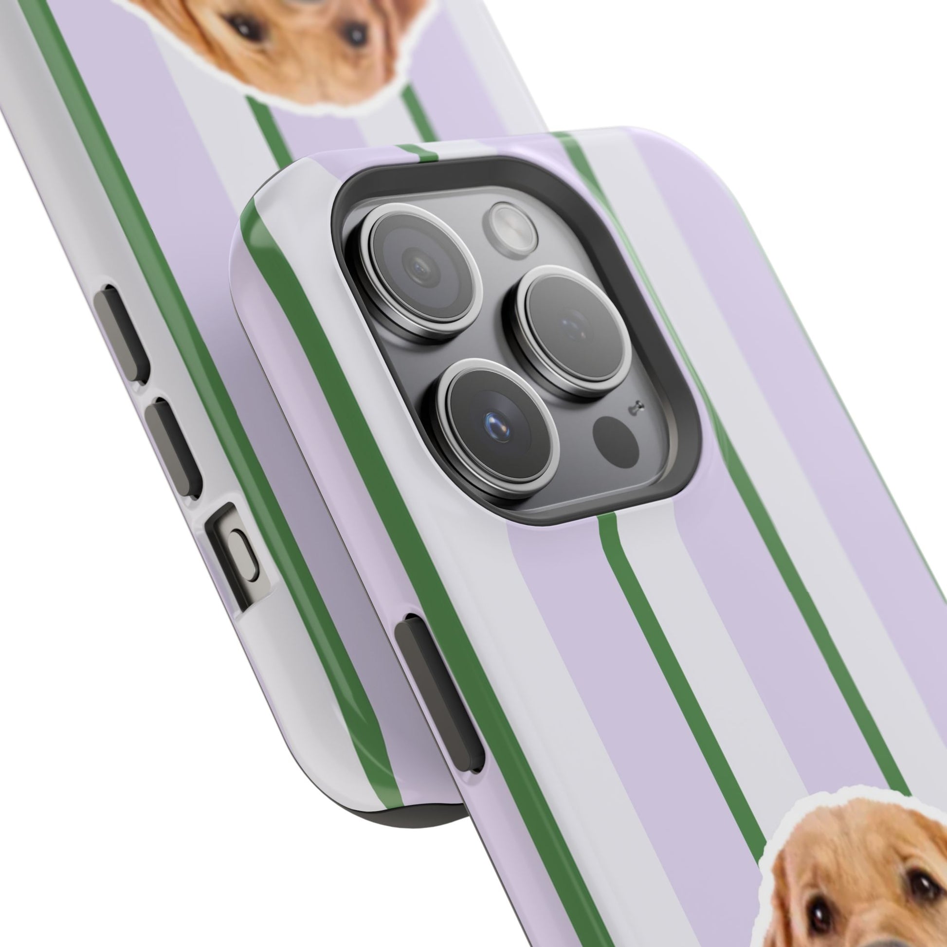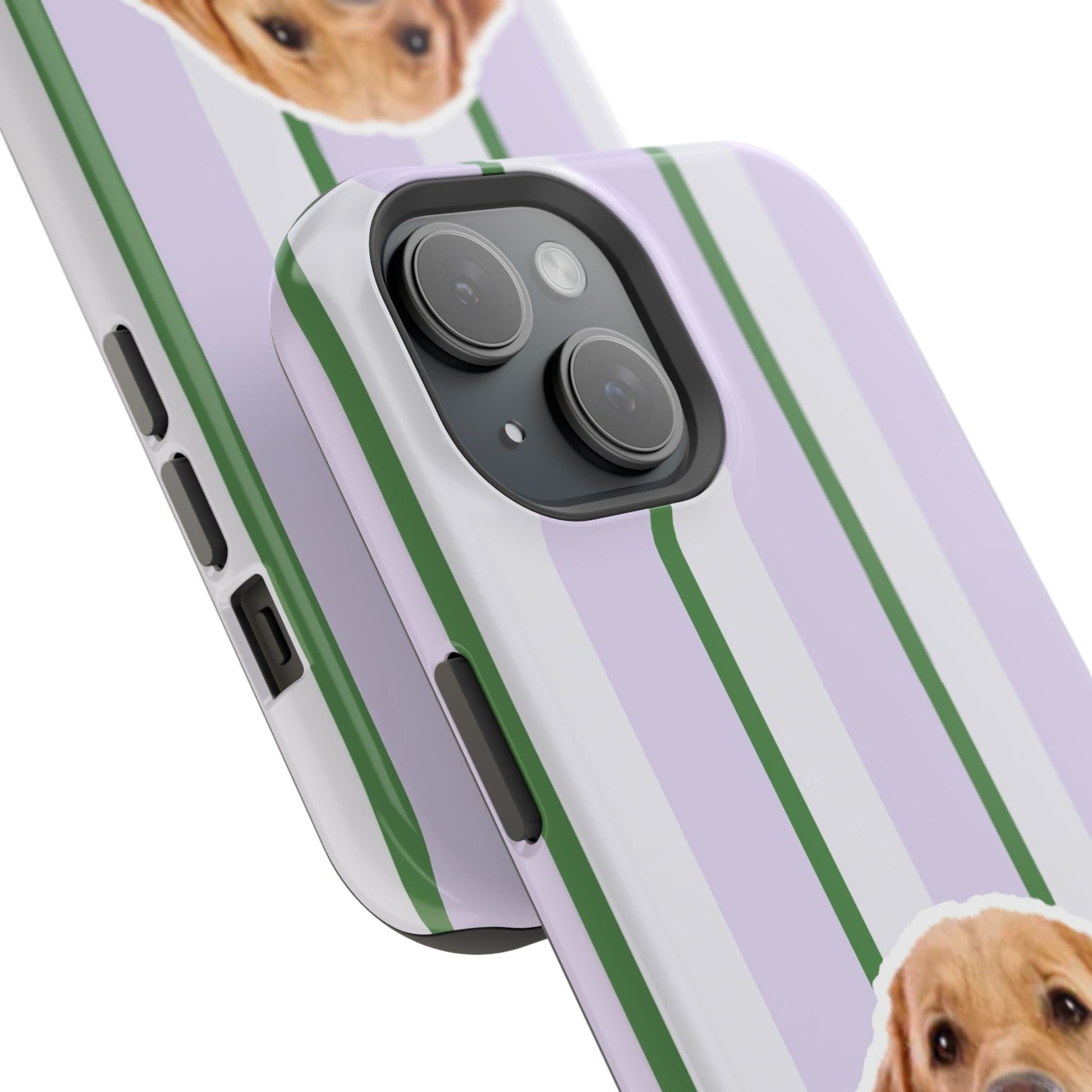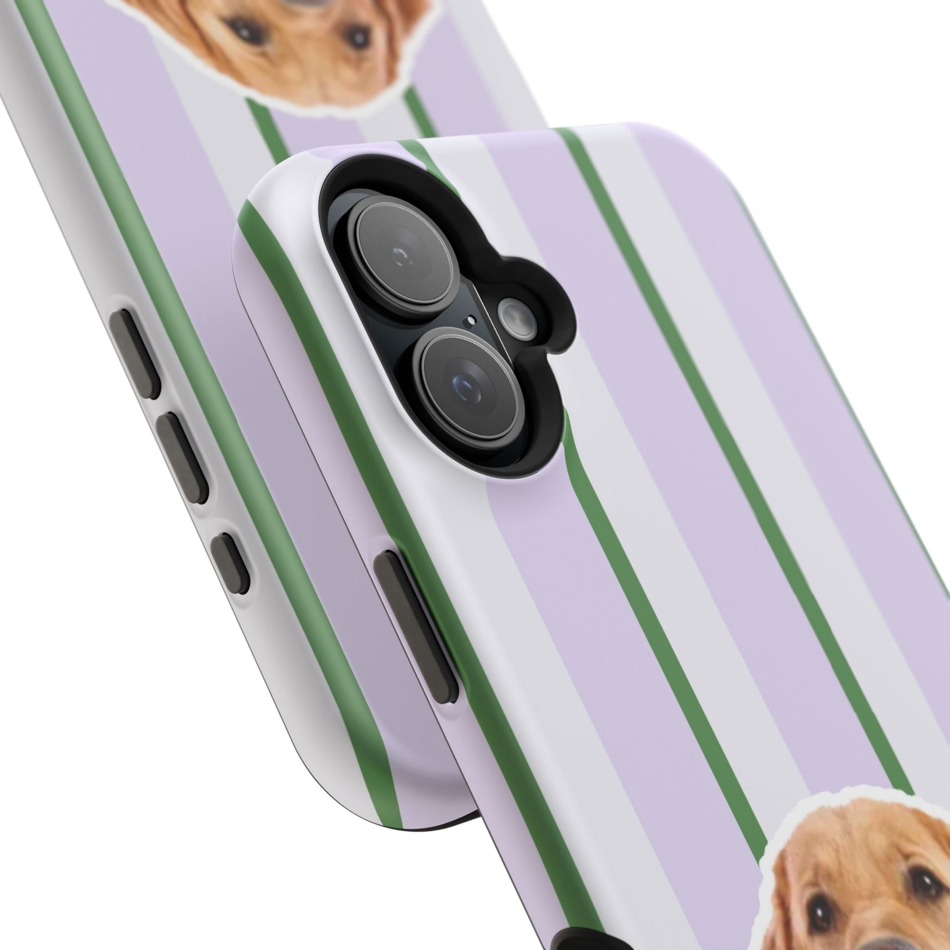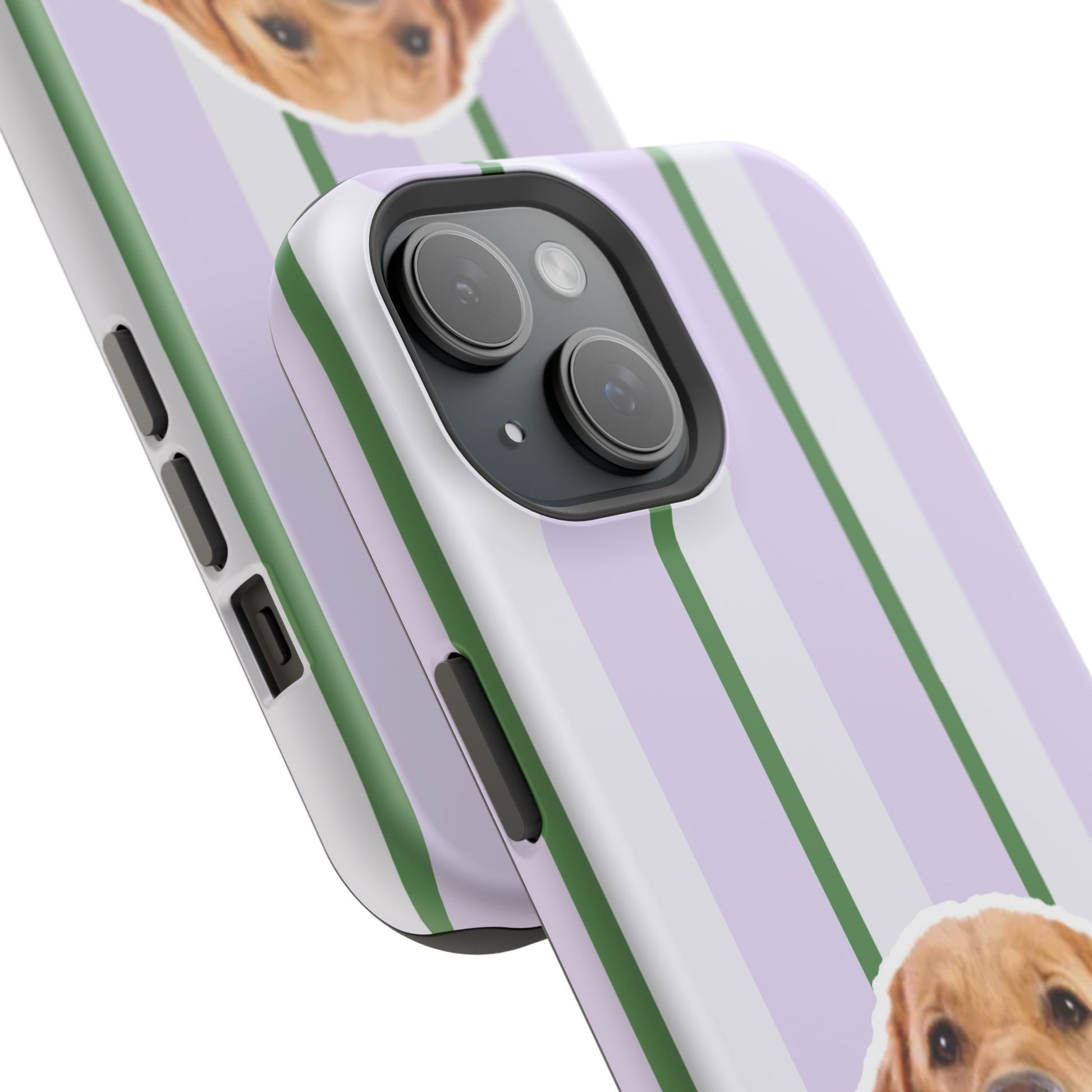 This impact-resistant magnetic phone case brings cozy, everyday joy to how you carry your device. A dual-layer build shields phones from daily knocks while the cushioned TPU liner softens shocks. The design — soft lavender stripes with crisp green accents and a cheerful dog portrait — feels like a pocket-sized companion that brightens commutes, walks, and coffee runs. Slim enough for pockets, yet sturdy enough for a busy life, the embedded magnets let you snap on MagSafe accessories with confidence. Choose glossy for a lively sheen or matte for a subtle, tactile finish.