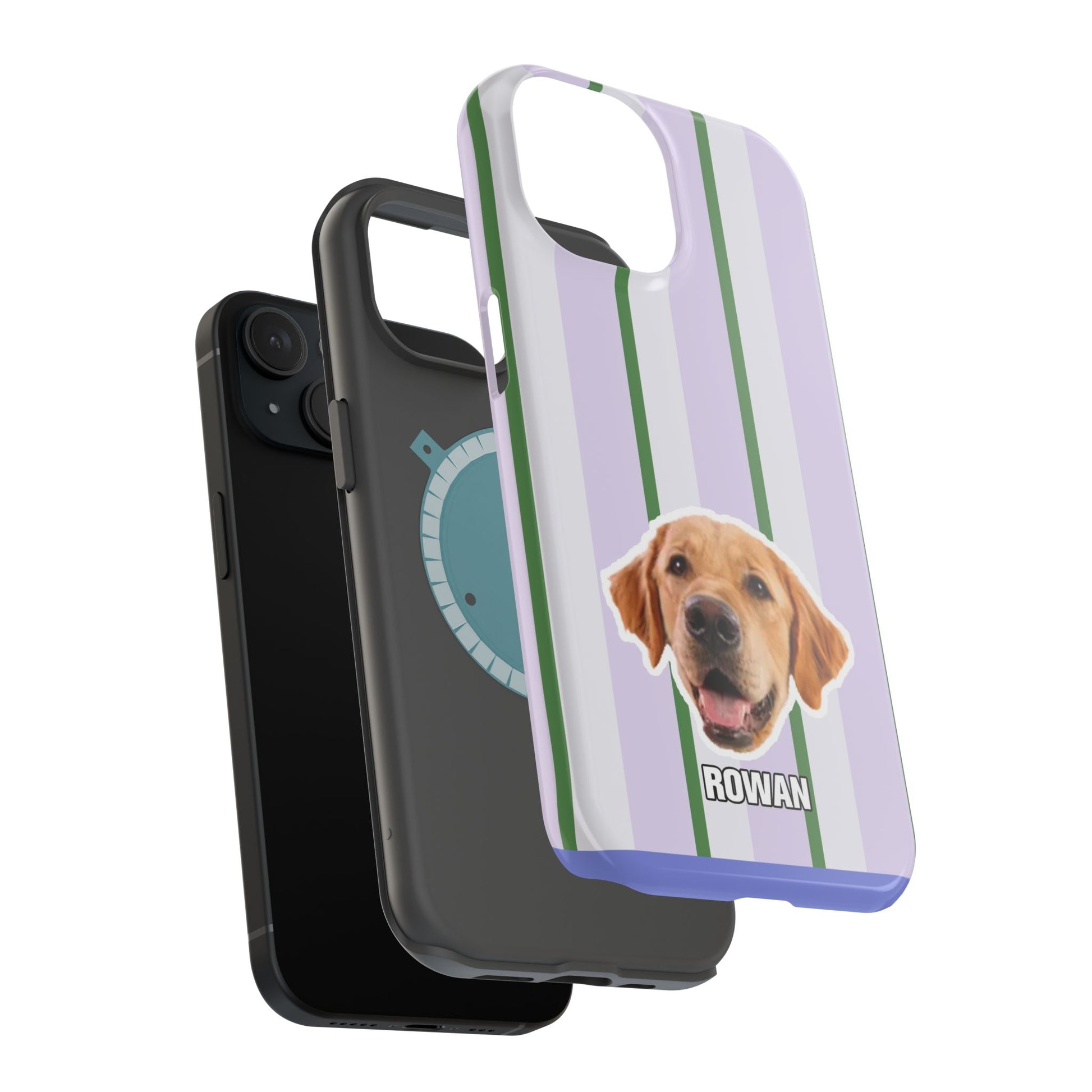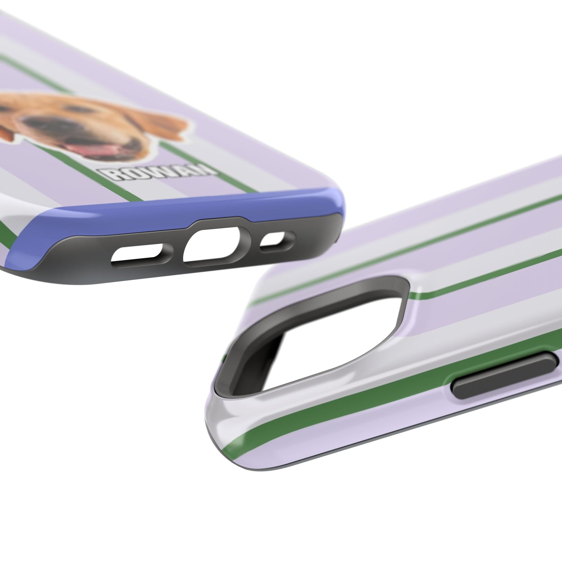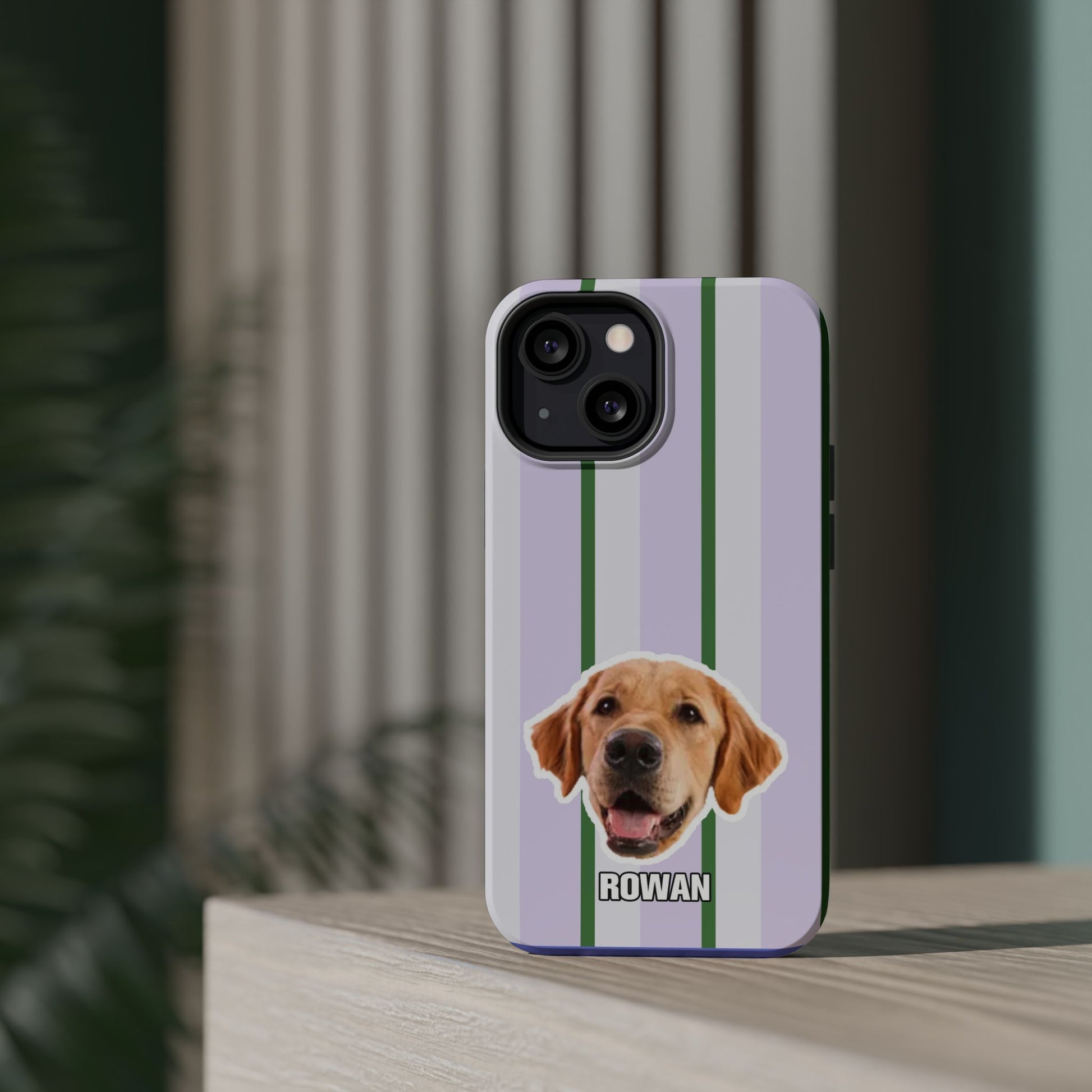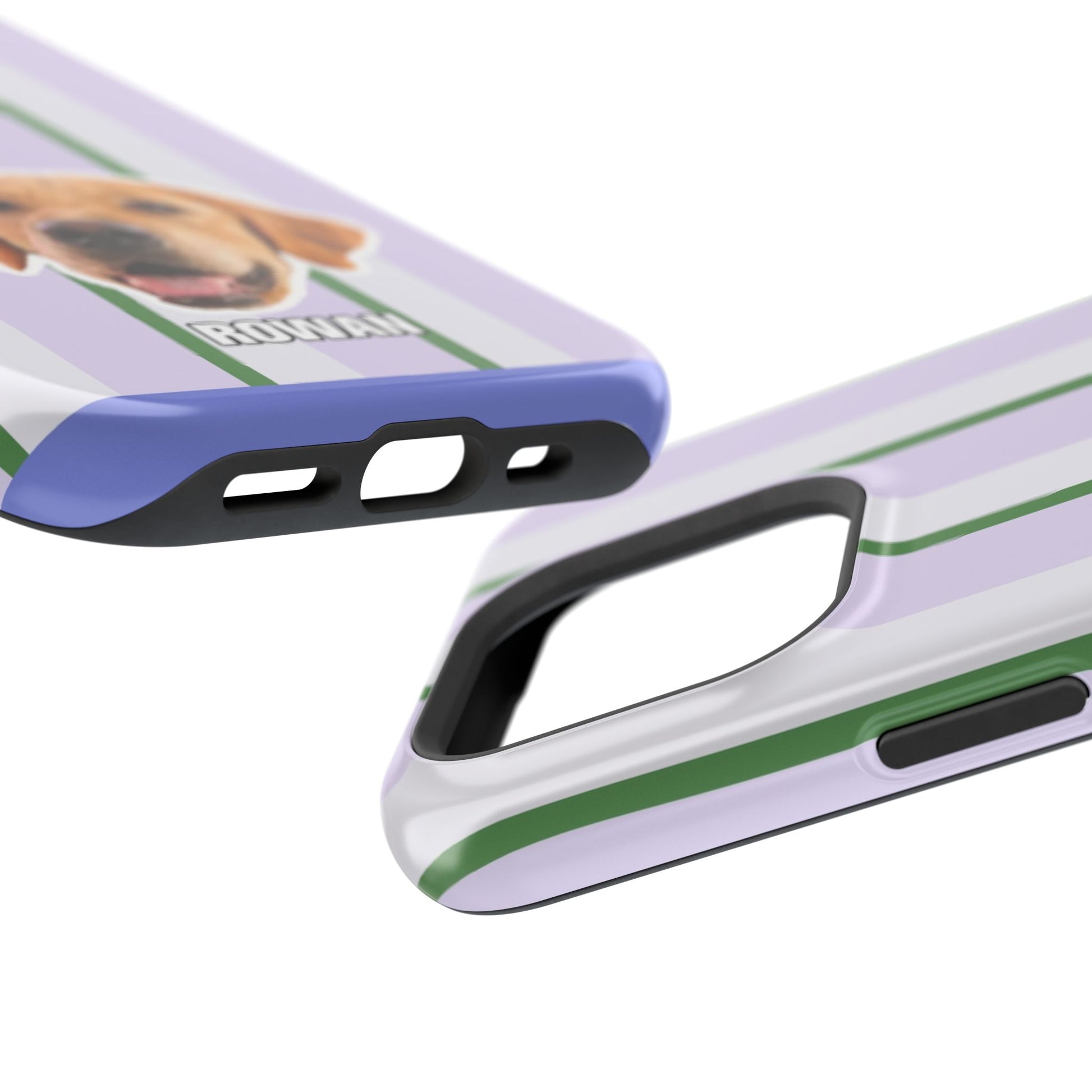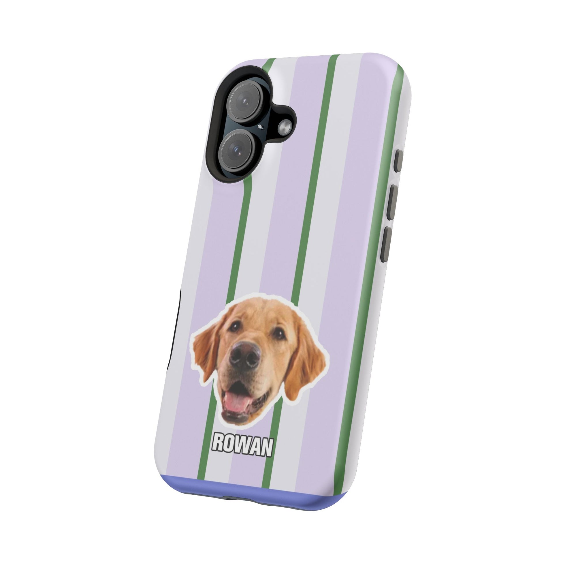 This impact-resistant magnetic phone case brings cozy, everyday joy to how you carry your device. A dual-layer build shields phones from daily knocks while the cushioned TPU liner softens shocks. The design — soft lavender stripes with crisp green accents and a cheerful dog portrait — feels like a pocket-sized companion that brightens commutes, walks, and coffee runs. Slim enough for pockets, yet sturdy enough for a busy life, the embedded magnets let you snap on MagSafe accessories with confidence. Choose glossy for a lively sheen or matte for a subtle, tactile finish.