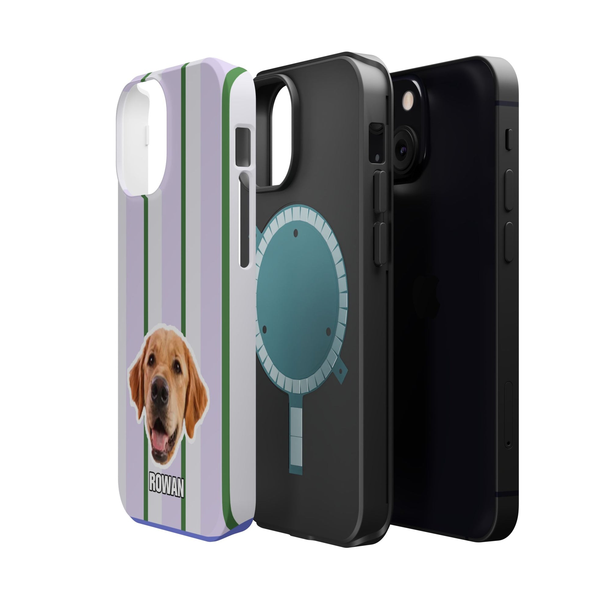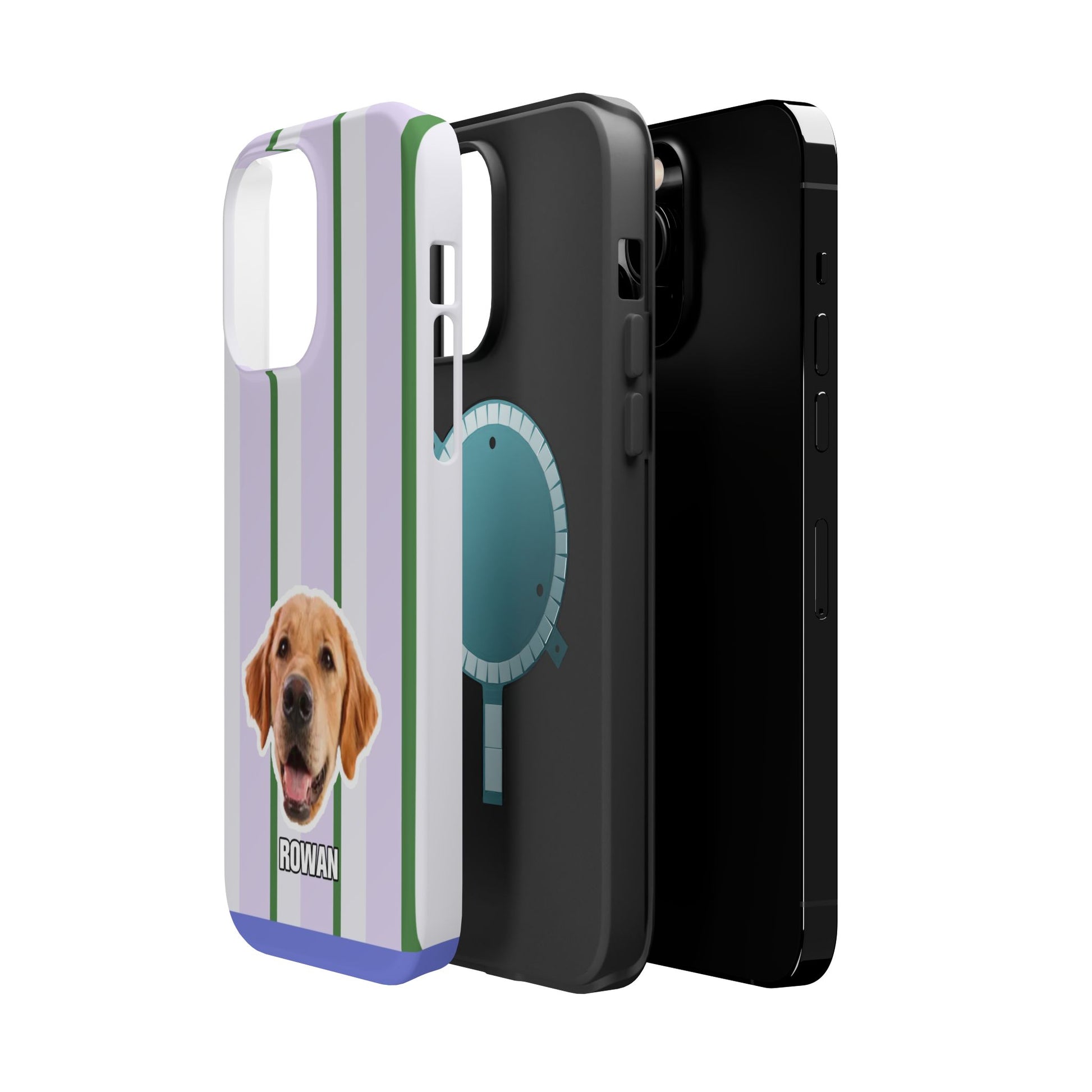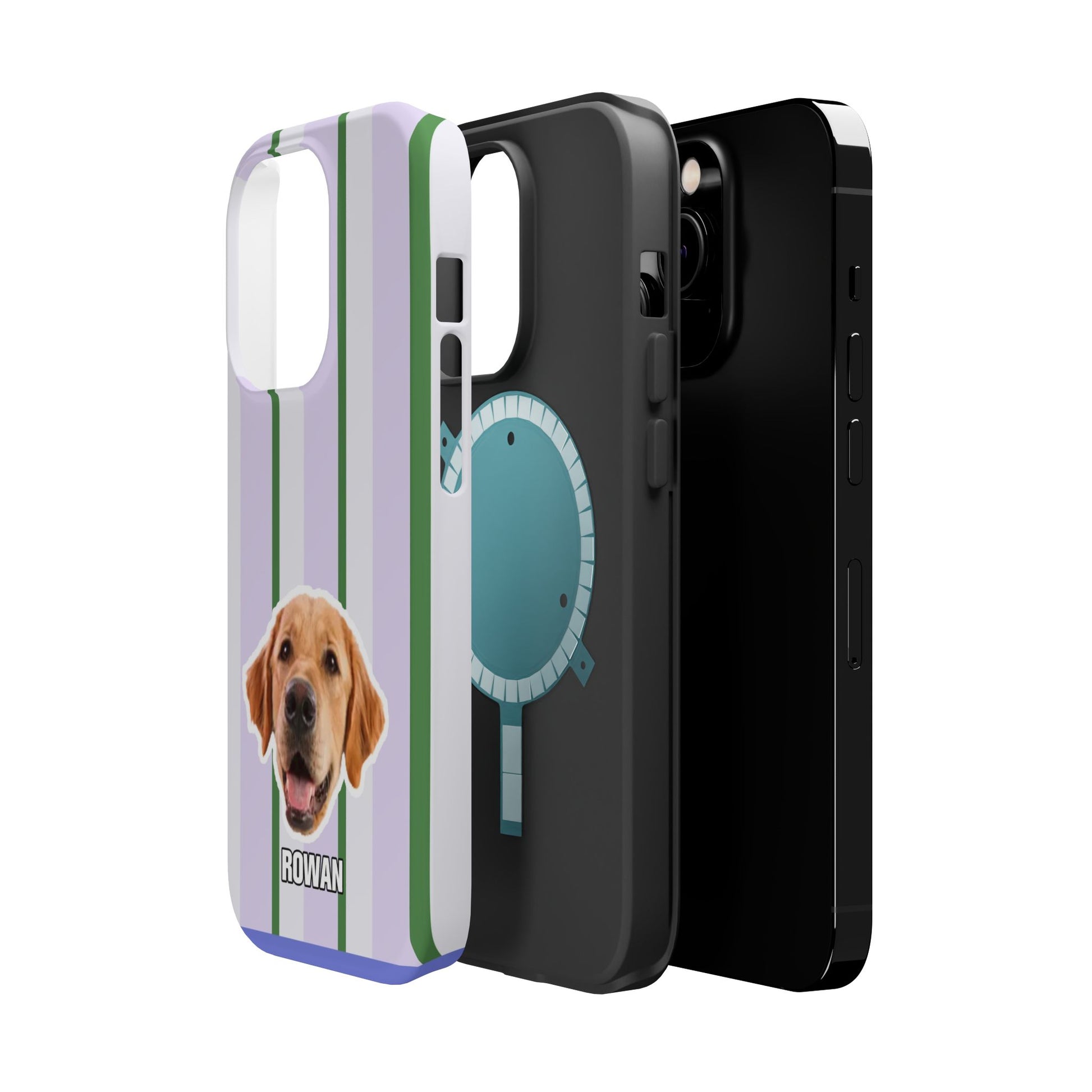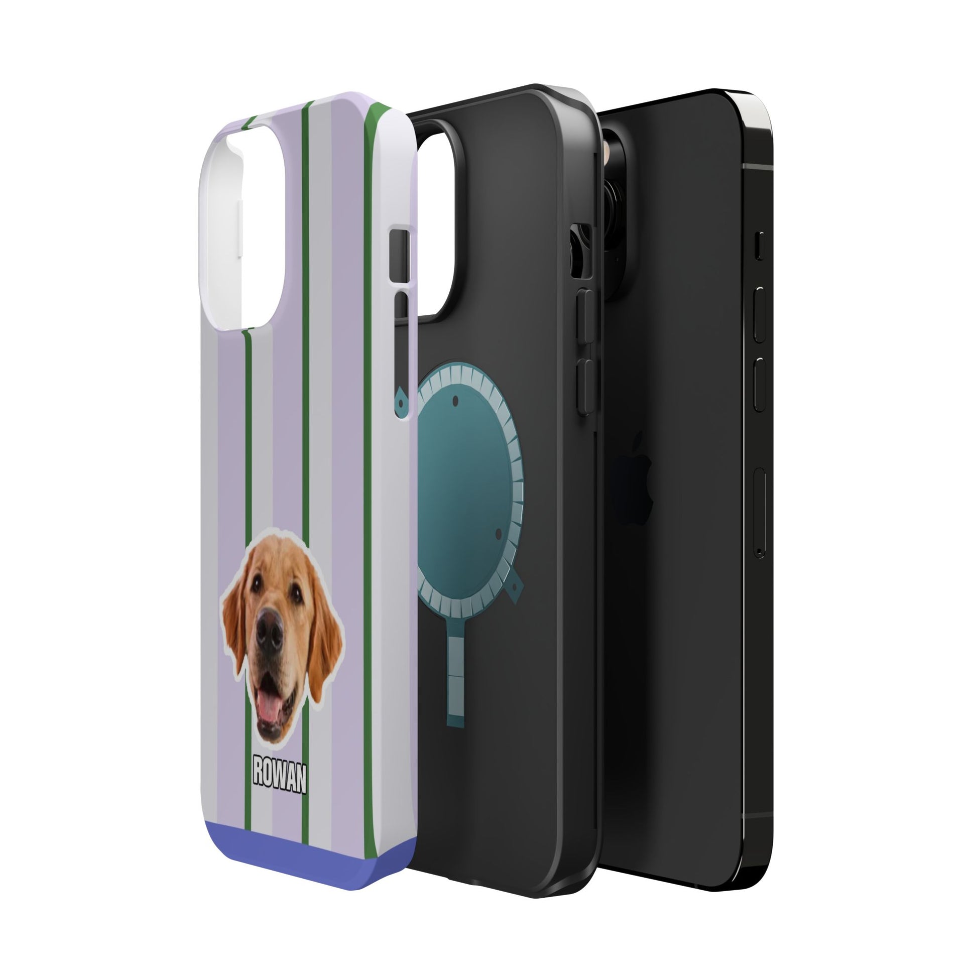 This impact-resistant magnetic phone case brings cozy, everyday joy to how you carry your device. A dual-layer build shields phones from daily knocks while the cushioned TPU liner softens shocks. The design — soft lavender stripes with crisp green accents and a cheerful dog portrait — feels like a pocket-sized companion that brightens commutes, walks, and coffee runs. Slim enough for pockets, yet sturdy enough for a busy life, the embedded magnets let you snap on MagSafe accessories with confidence. Choose glossy for a lively sheen or matte for a subtle, tactile finish.