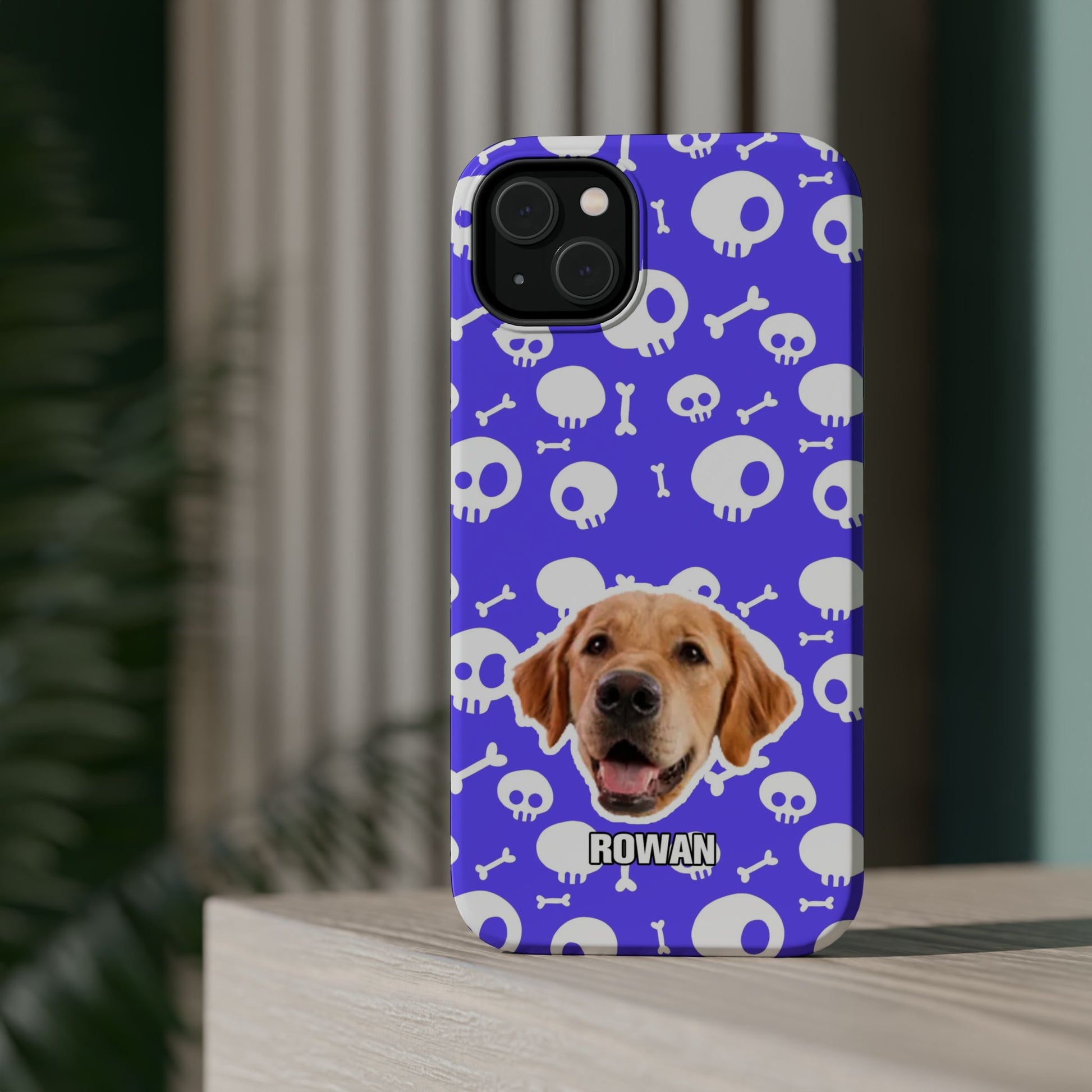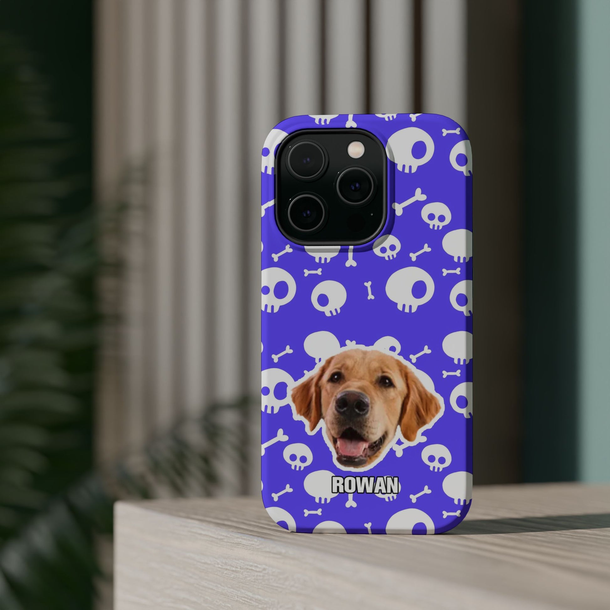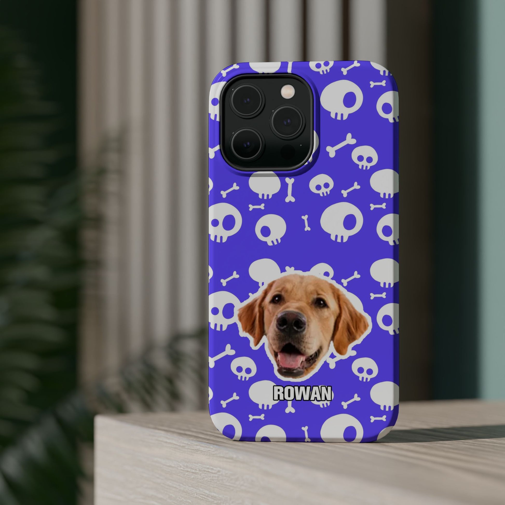 Slip this impact-resistant phone case onto your device and carry a little playful companionship everywhere you go. The vivid, full-wrap print showcases a cheerful dog portrait set against a skull-and-bone pattern in bright, saturated color — a fun mix of sweet and edgy that stands out in a crowd. The dual-layer construction (rigid polycarbonate shell with a cushioned TPU liner) keeps daily knocks and minor drops from turning into headaches, while the embedded magnet supports MagSafe-style accessories for hands-free convenience. Choose glossy or matte to match your style, and let this case be the small, durable touch that makes your phone unmistakably yours.