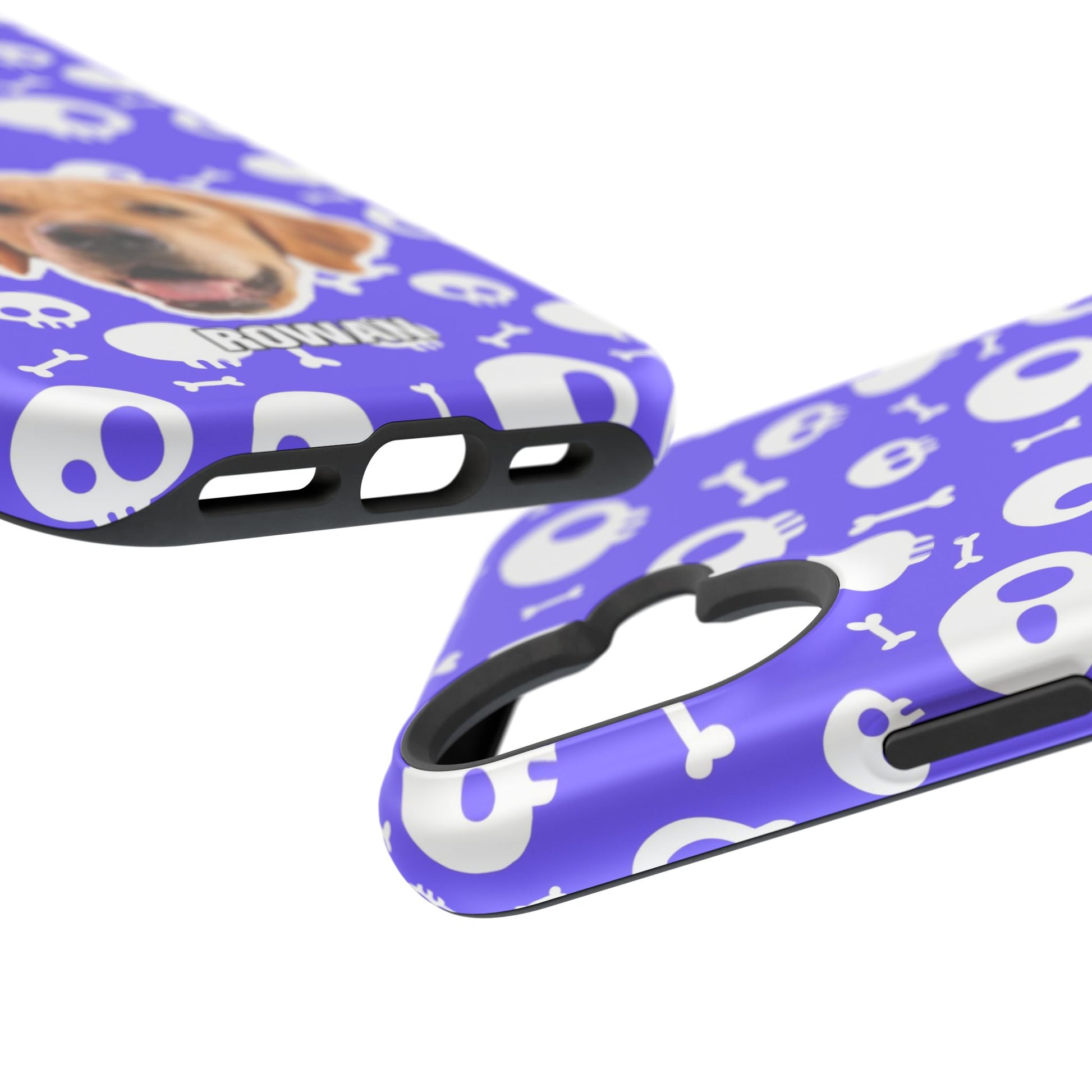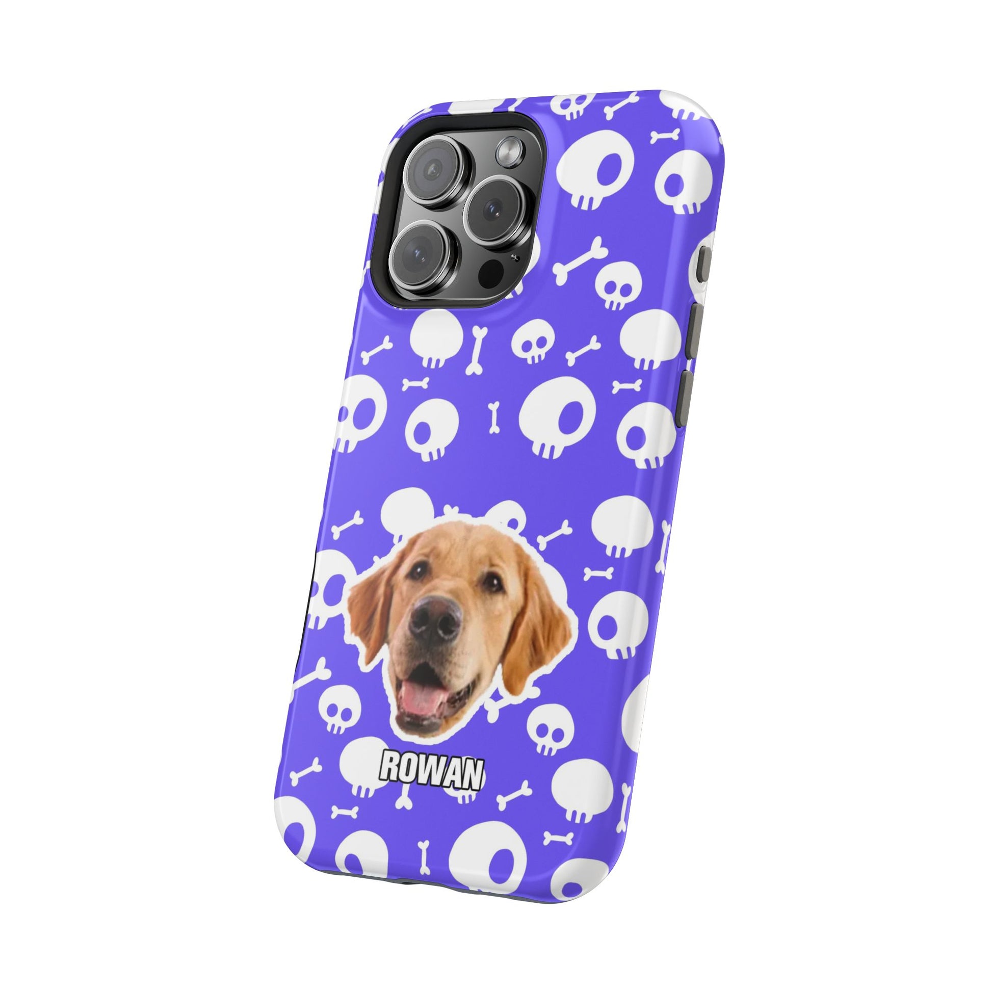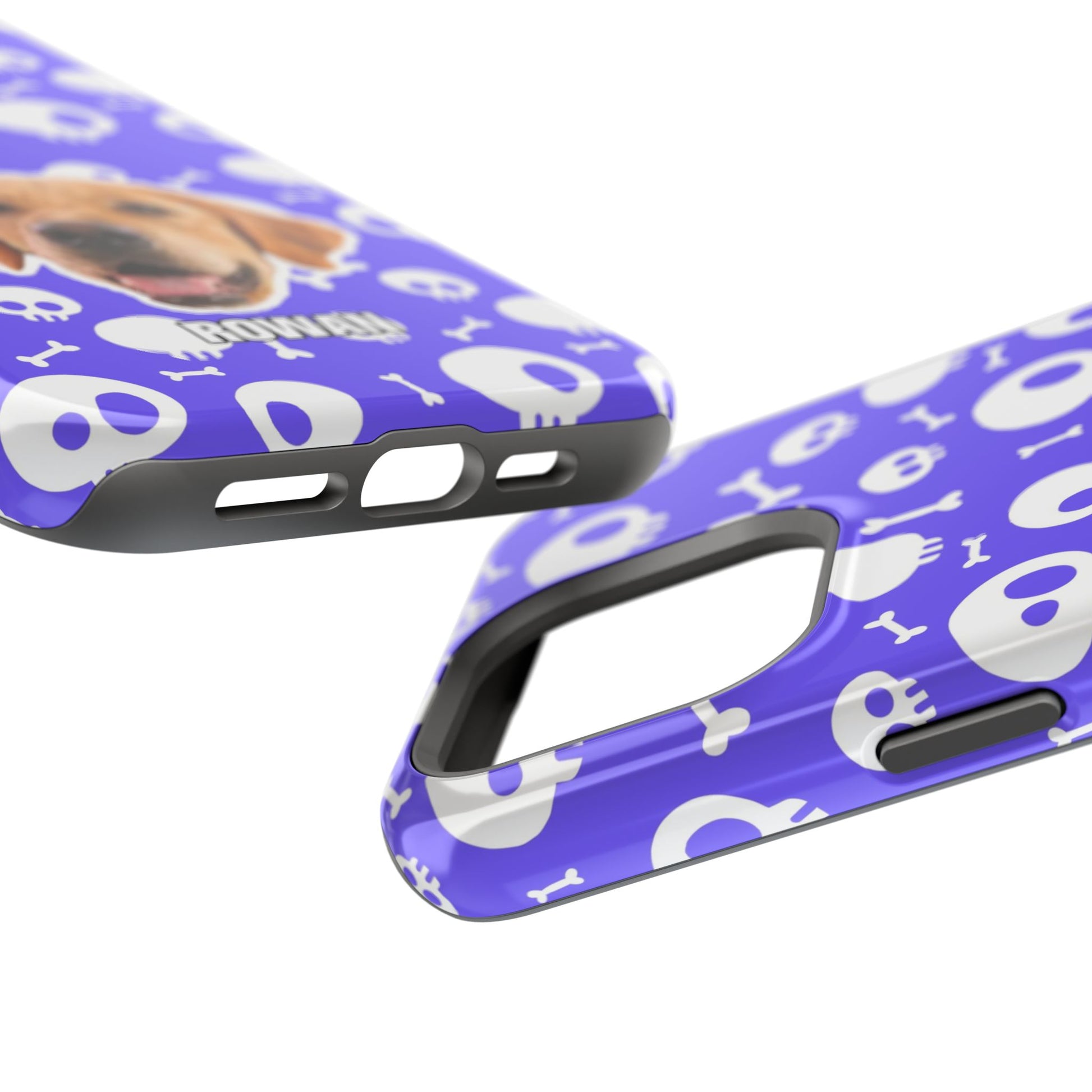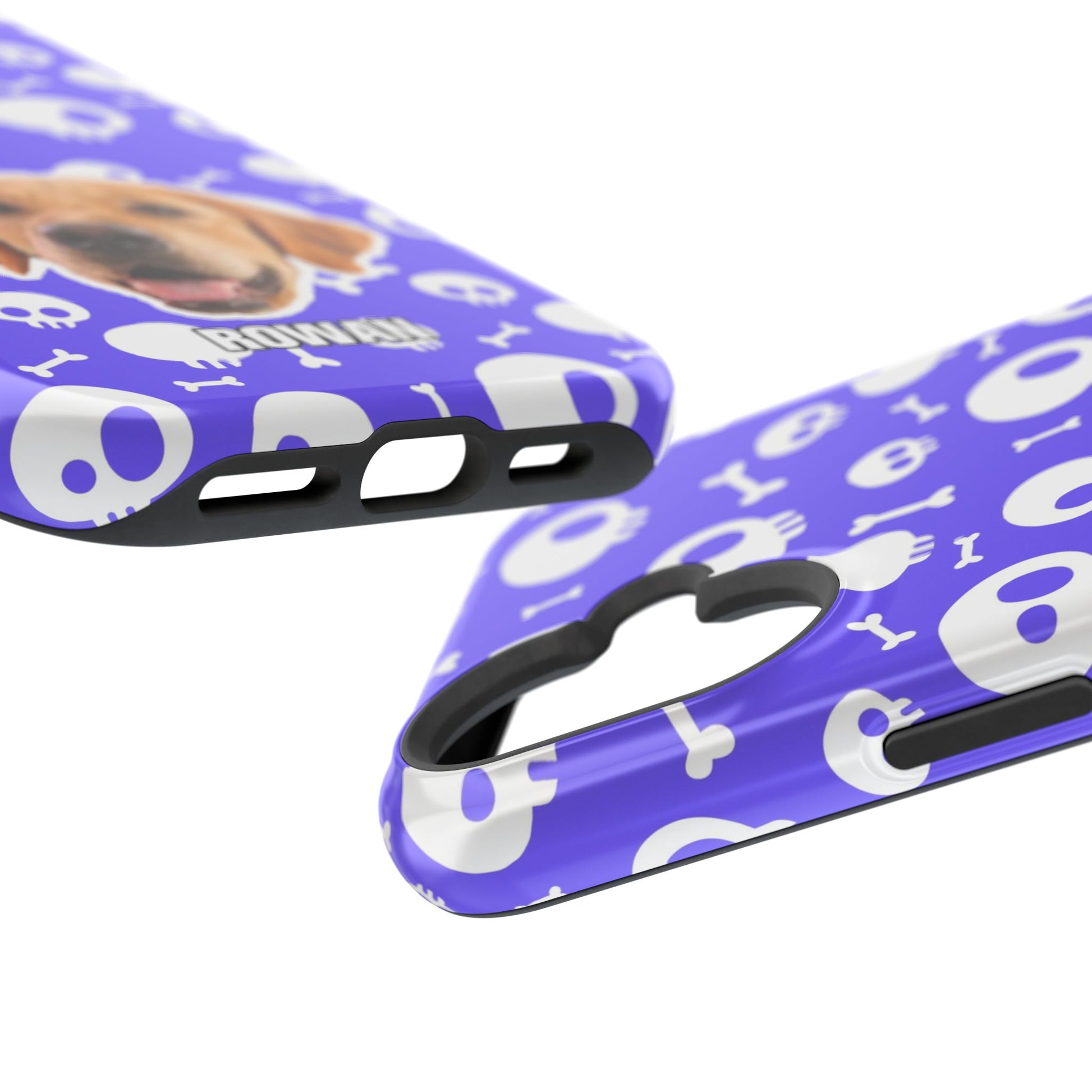 Slip this impact-resistant phone case onto your device and carry a little playful companionship everywhere you go. The vivid, full-wrap print showcases a cheerful dog portrait set against a skull-and-bone pattern in bright, saturated color — a fun mix of sweet and edgy that stands out in a crowd. The dual-layer construction (rigid polycarbonate shell with a cushioned TPU liner) keeps daily knocks and minor drops from turning into headaches, while the embedded magnet supports MagSafe-style accessories for hands-free convenience. Choose glossy or matte to match your style, and let this case be the small, durable touch that makes your phone unmistakably yours.