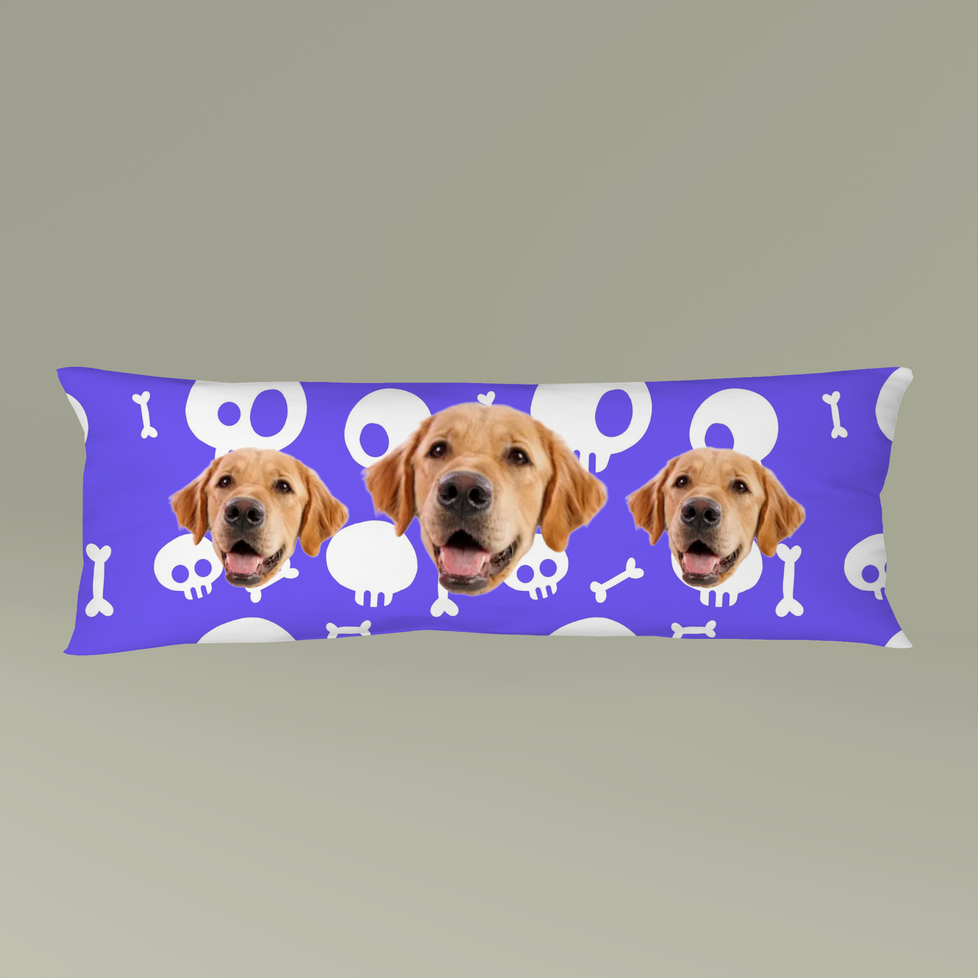 Curl up with a long, plush body pillow that brings a playful, comforting presence to lazy afternoons and late-night lounging. Bright purple backgrounds patterned with whimsical skulls and bones set a bold, slightly spooky scene, while smiling golden retriever faces repeat across the length — friendly, familiar, and instantly homey. The soft, fleece/microfiber cover feels warm against skin and drapes easily across a couch or bed. Machine-washable and finished with a hidden zipper, this pillow stays fresh and looks seamless on display. Let it lean against your headboard during movie nights, support your knees while you read, or sit in a sunny window where its cheerful companion faces can make you smile all day.