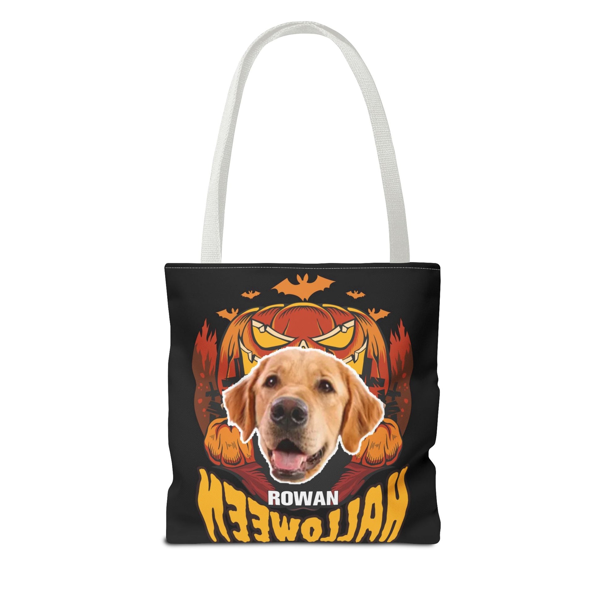 This roomy tote brings Halloween mischief and warm, familiar faces together. A friendly golden retriever peeks from a carved pumpkin backdrop, surrounded by flickering flames and tiny bats — a playful, cozy scene that reads like a neighborhood porch on October evenings. Carry it to fall festivals, autumn walks with your dog, or when you want a bit of seasonal charm at the grocery store. The sturdy polyester body and boxed corners hold treats, sweaters, or pet supplies without sagging, while reinforced handles stand up to daily use. It feels like carrying a little ritual: the crunch of leaves, the glow of jack-o’-lanterns, and your pup’s happy snuffle at your side.