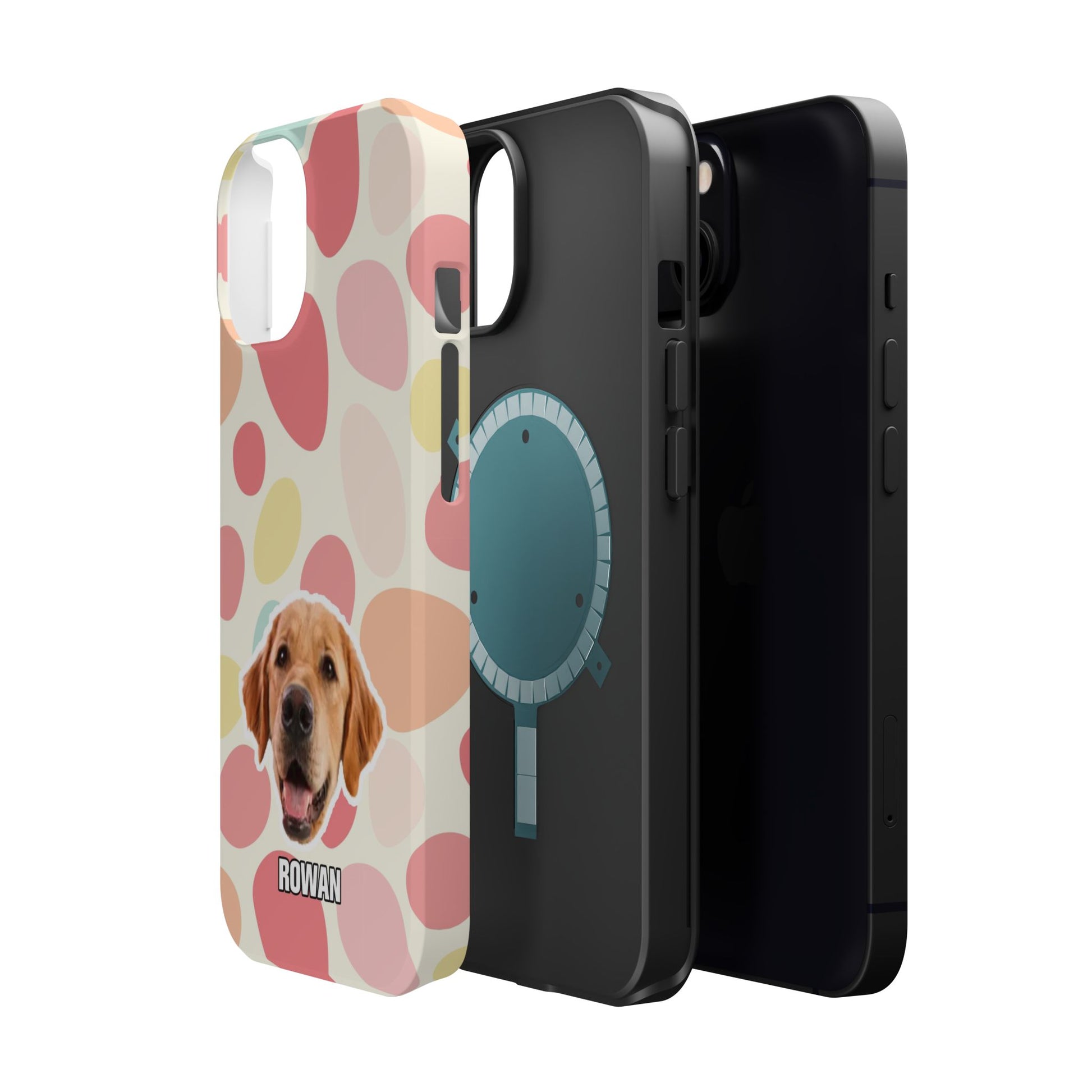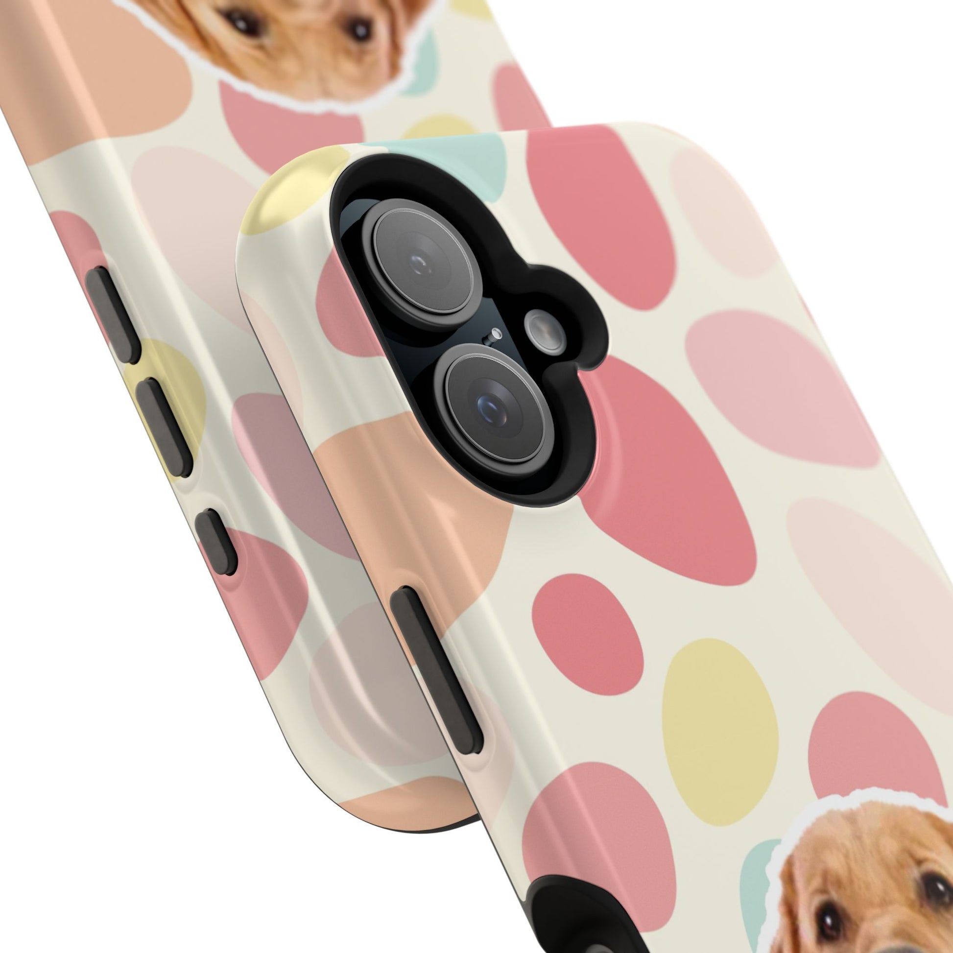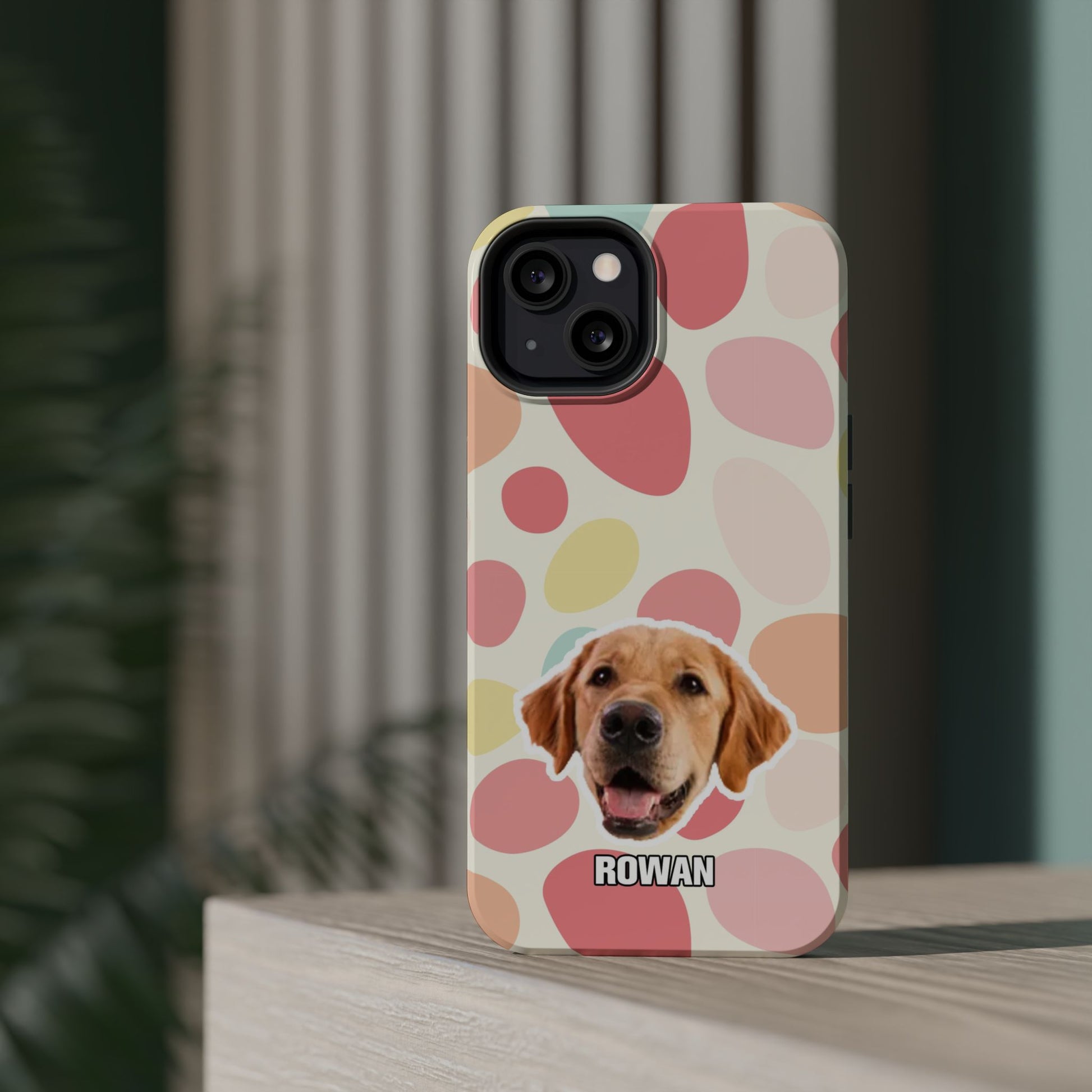A colorful, impact-resistant phone case that brings playful personality to your everyday carry. The full-wrap print uses photo-realistic, high-DPI color to showcase a whimsical pebble-pattern backdrop with a centered pet portrait and name—small enough to feel personal, bold enough to be noticed. The case’s rigid polycarbonate shell and cushioned TPU liner work together to absorb knocks and protect edges while keeping a slim profile. Choose glossy or matte finishes to match your style; embedded magnets allow MagSafe® accessories to align and attach. This case slips into daily life effortlessly: it brightens morning commutes, holds up to errands and coffee shop work sessions, and keeps your phone secure during walks with a favorite dog at your side.