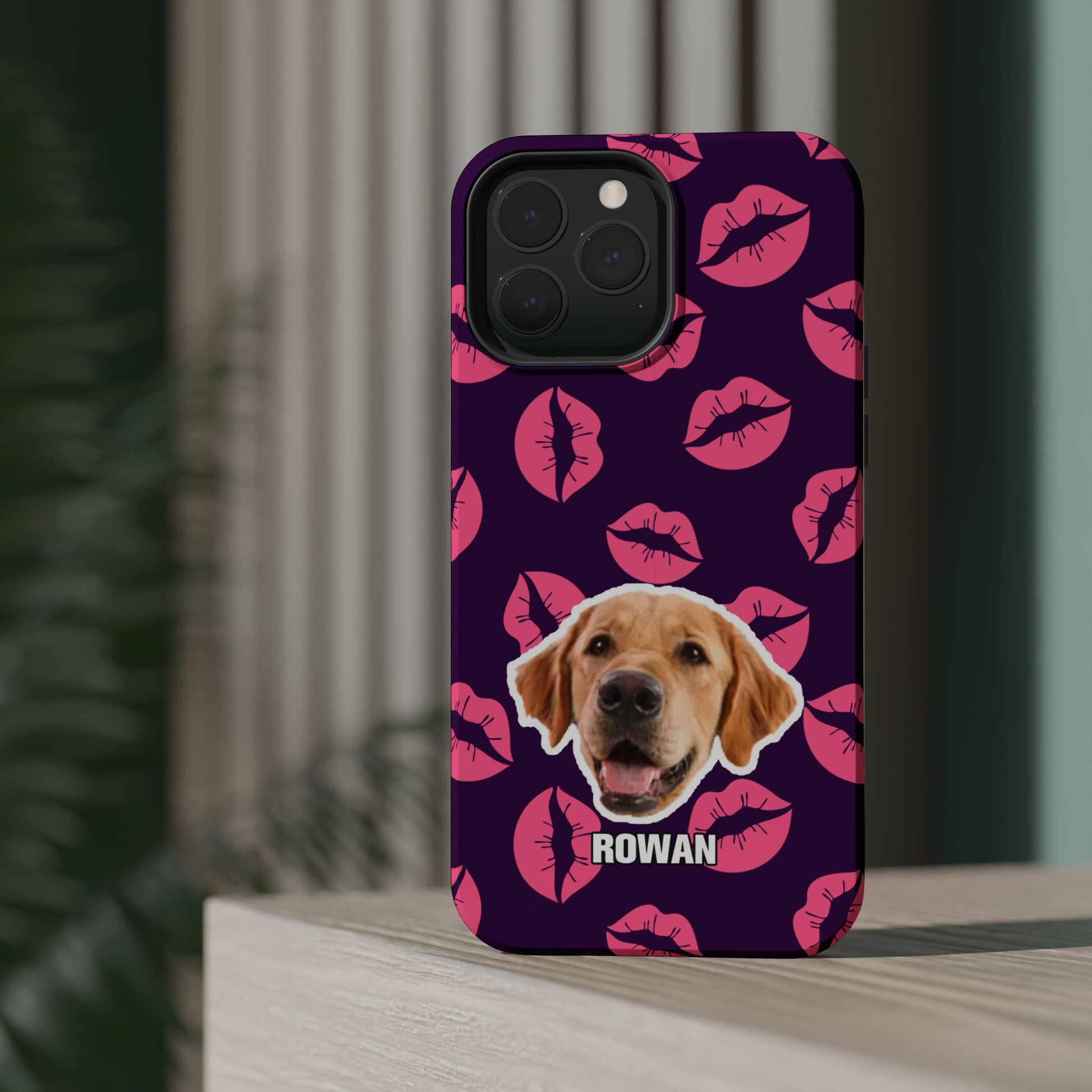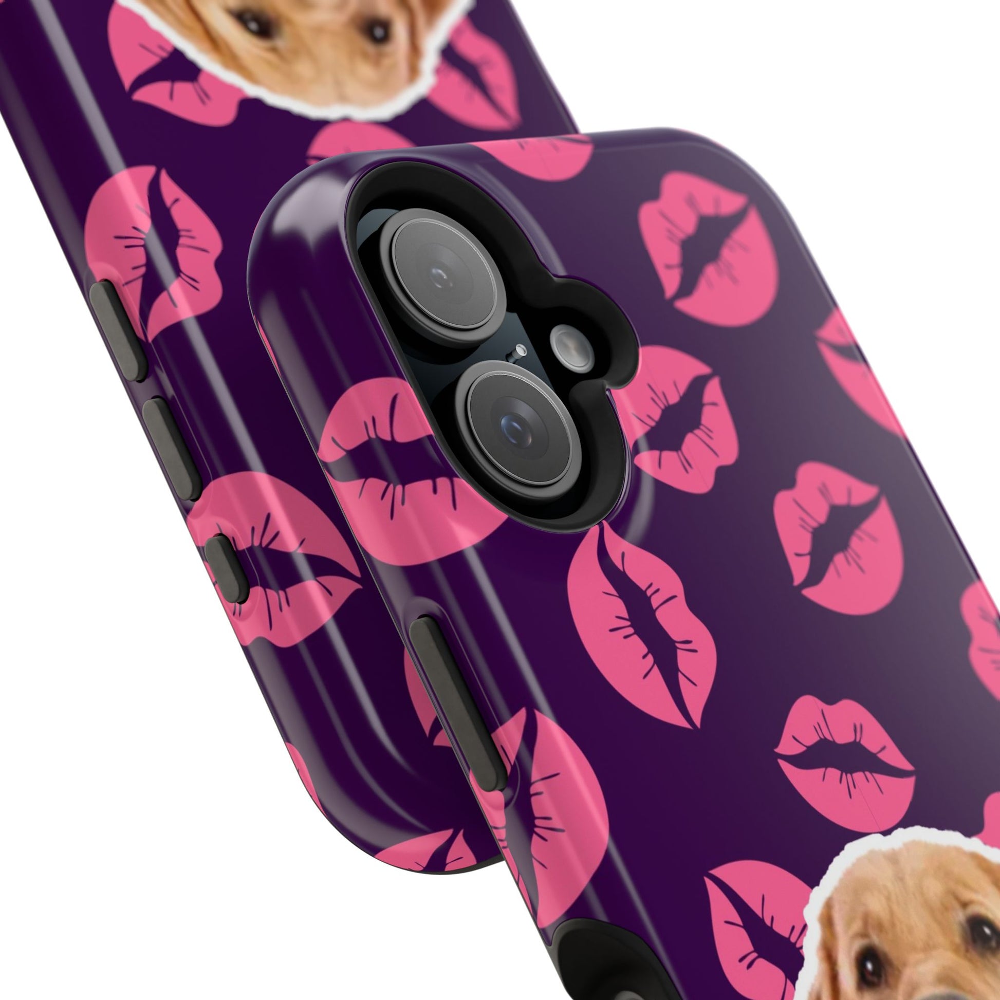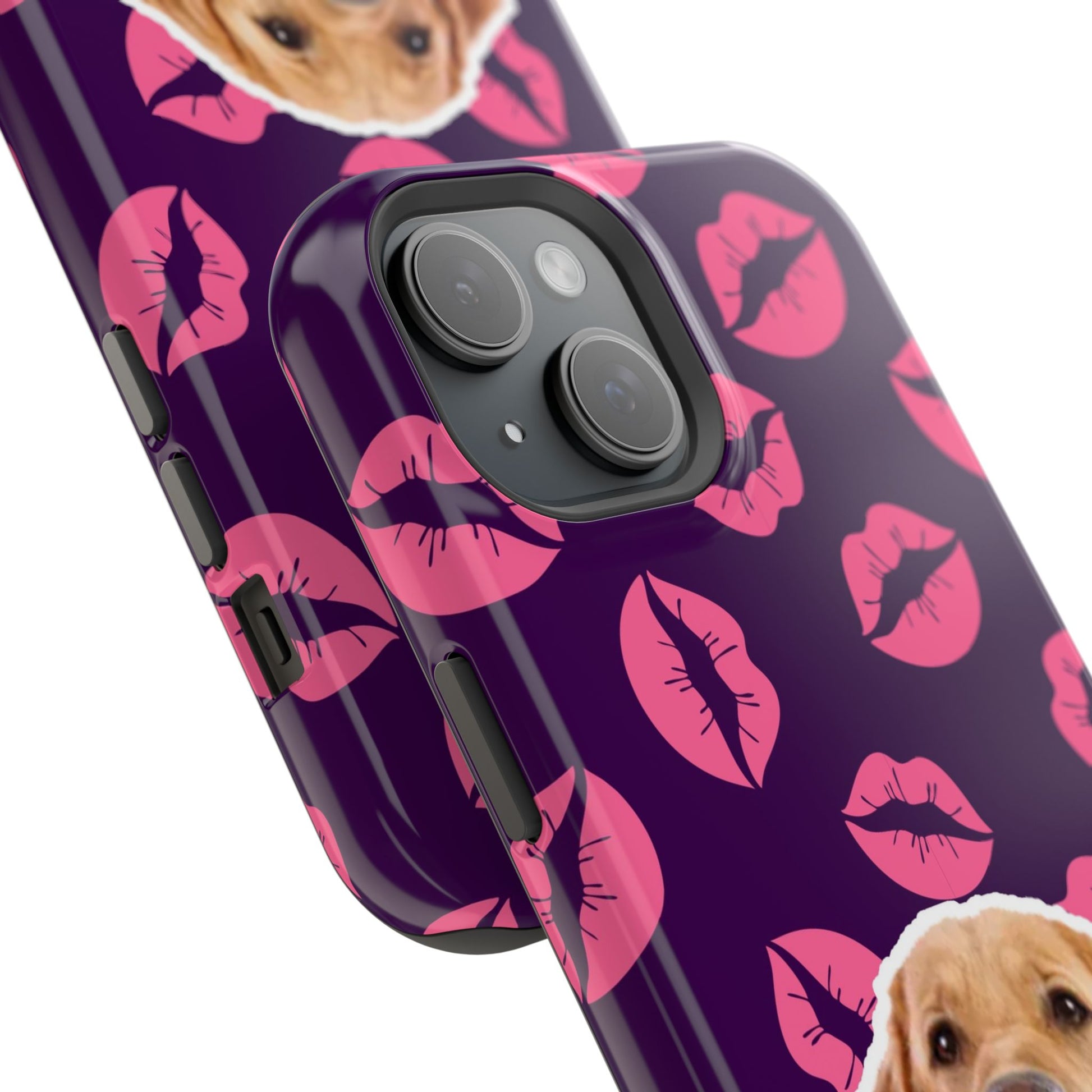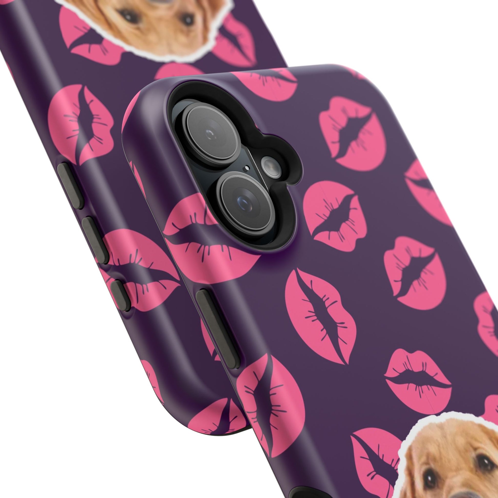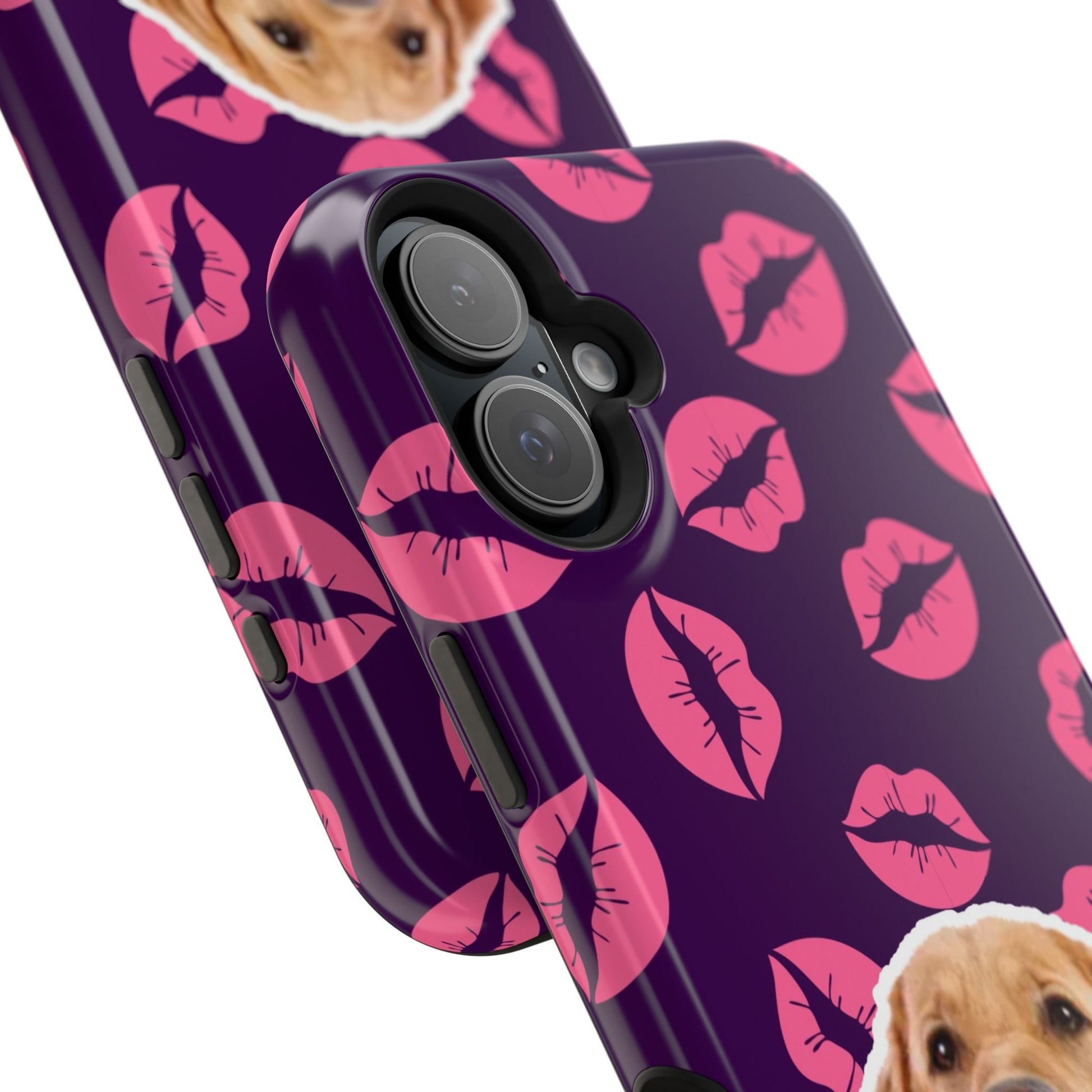 Bright, playful phone protection designed to spotlight a beloved pup and a bold pattern. This impact-resistant case wraps your device in a full-color print of magenta kiss marks against a deep plum background, with a cheerful dog portrait and name plate centered at the bottom. The dual-layer construction—rigid polycarbonate shell with a cushioned TPU liner—keeps the edges and back shielded from scratches and everyday knocks. Choose glossy for a vivid shine or matte for a smooth, subtle finish. Lightweight and tactile, it slips into life seamlessly: coffee runs, walks in the park, or cozy nights at home when you want your phone to feel personal and fun.