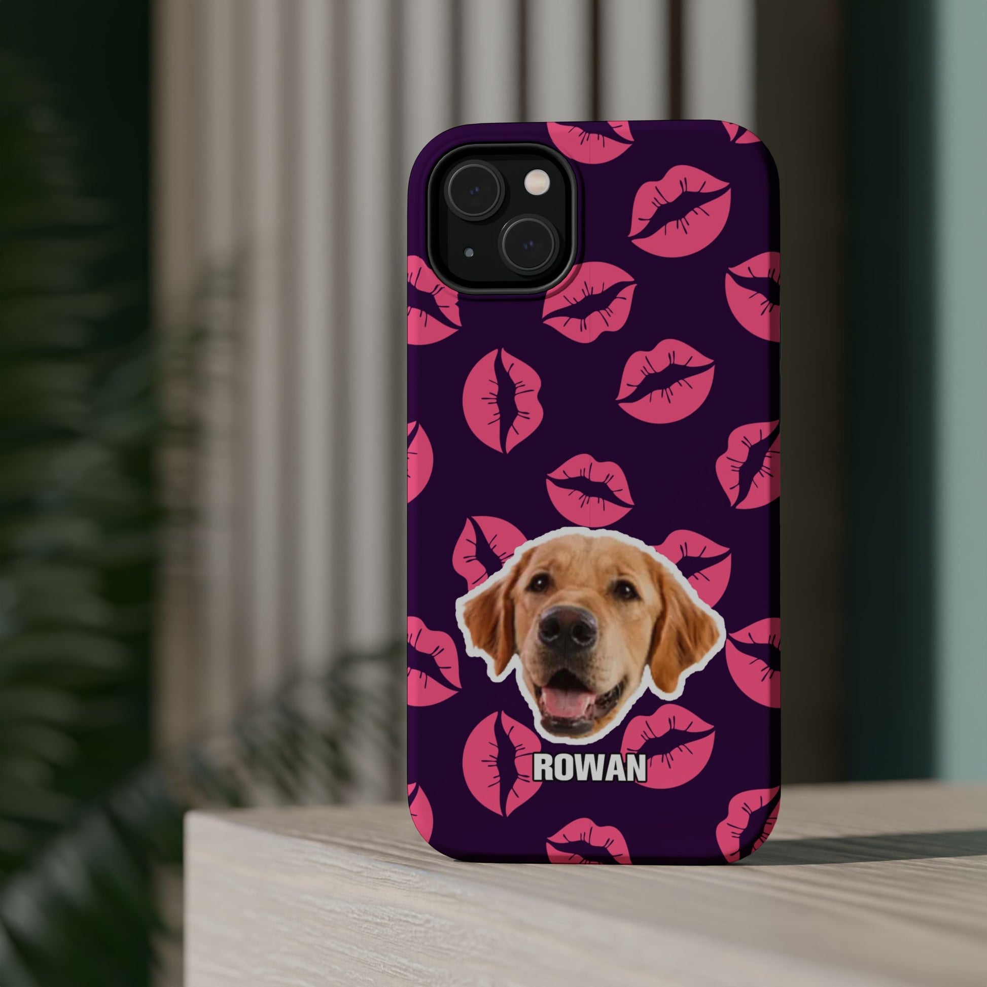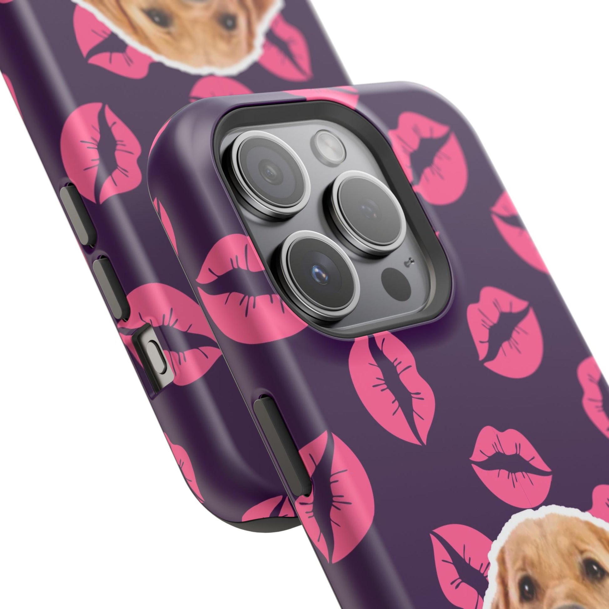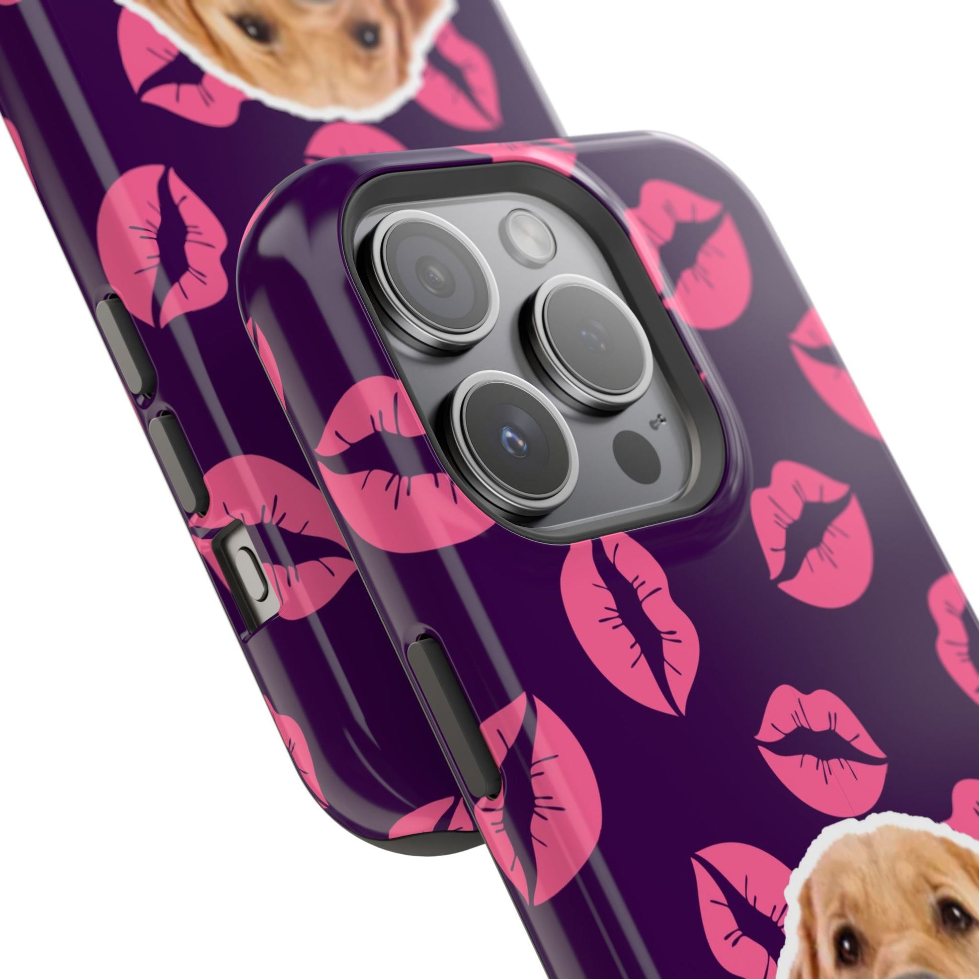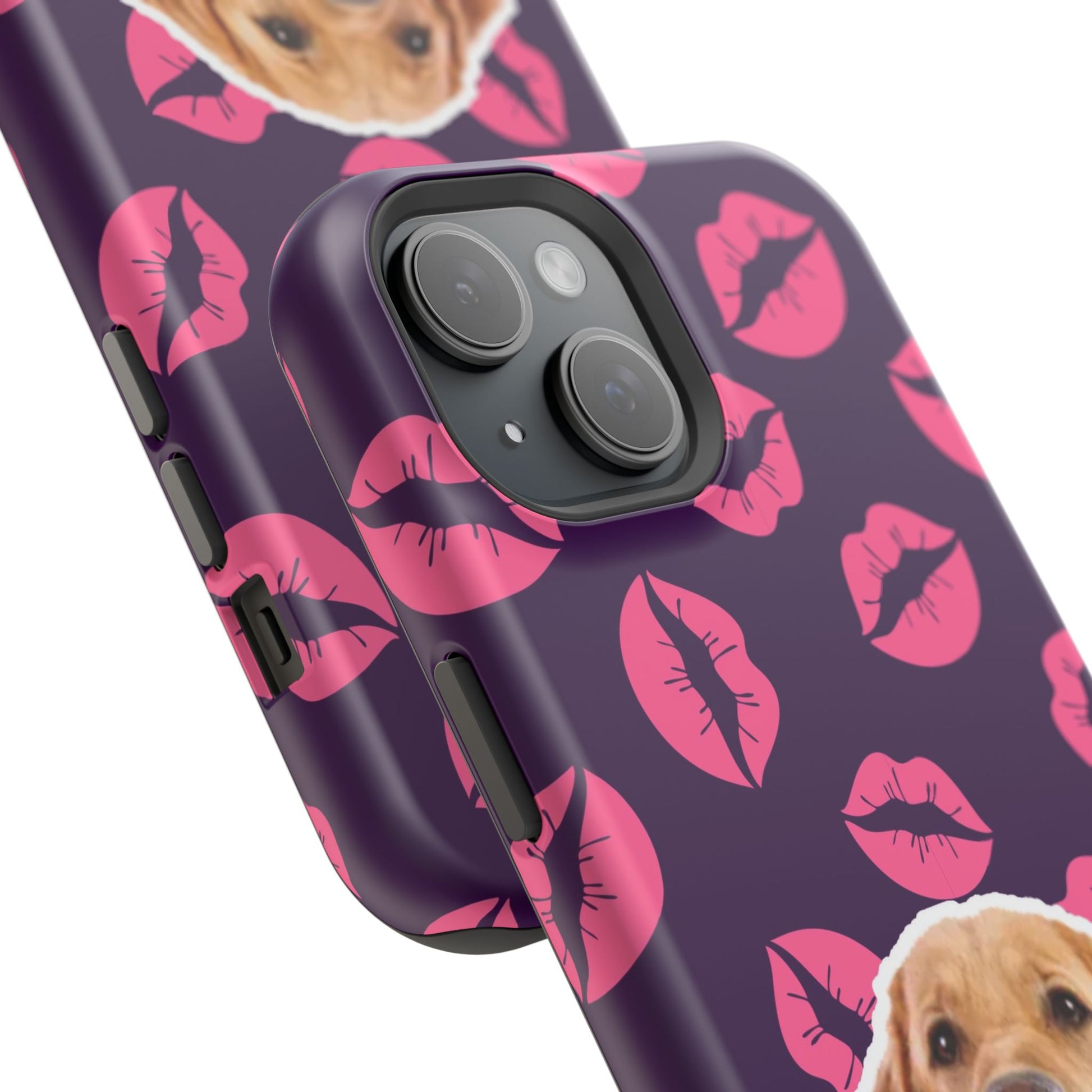 Bright, playful phone protection designed to spotlight a beloved pup and a bold pattern. This impact-resistant case wraps your device in a full-color print of magenta kiss marks against a deep plum background, with a cheerful dog portrait and name plate centered at the bottom. The dual-layer construction—rigid polycarbonate shell with a cushioned TPU liner—keeps the edges and back shielded from scratches and everyday knocks. Choose glossy for a vivid shine or matte for a smooth, subtle finish. Lightweight and tactile, it slips into life seamlessly: coffee runs, walks in the park, or cozy nights at home when you want your phone to feel personal and fun.