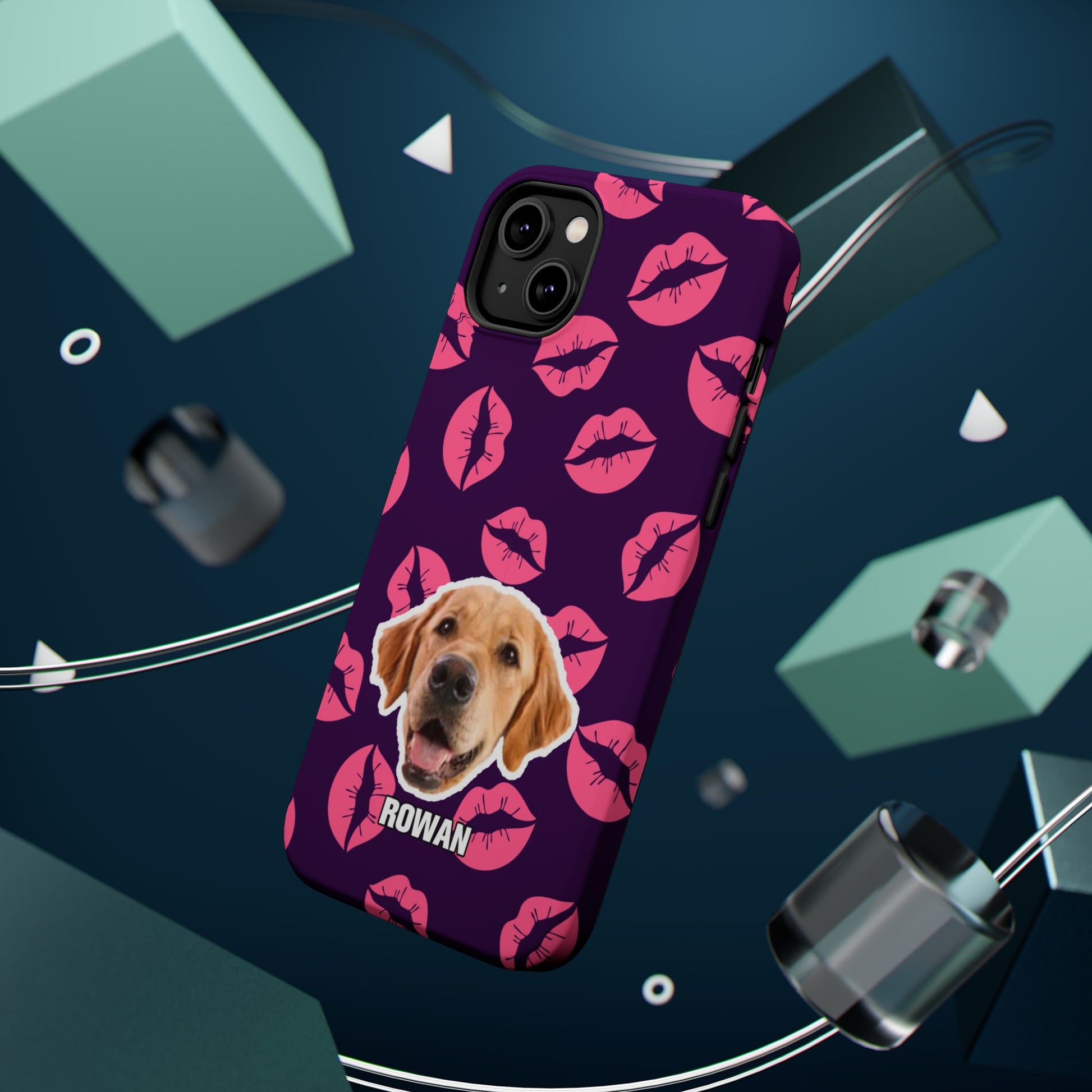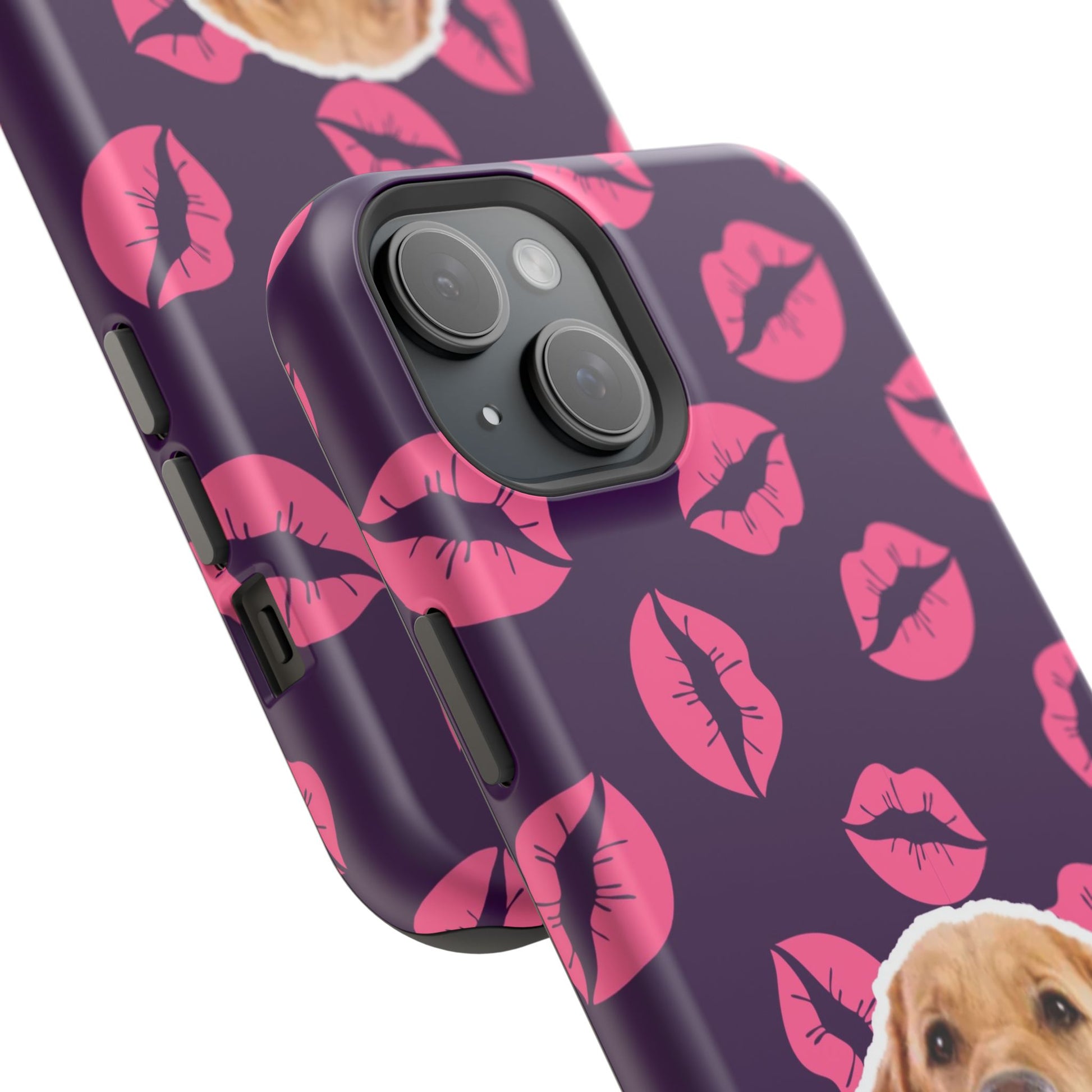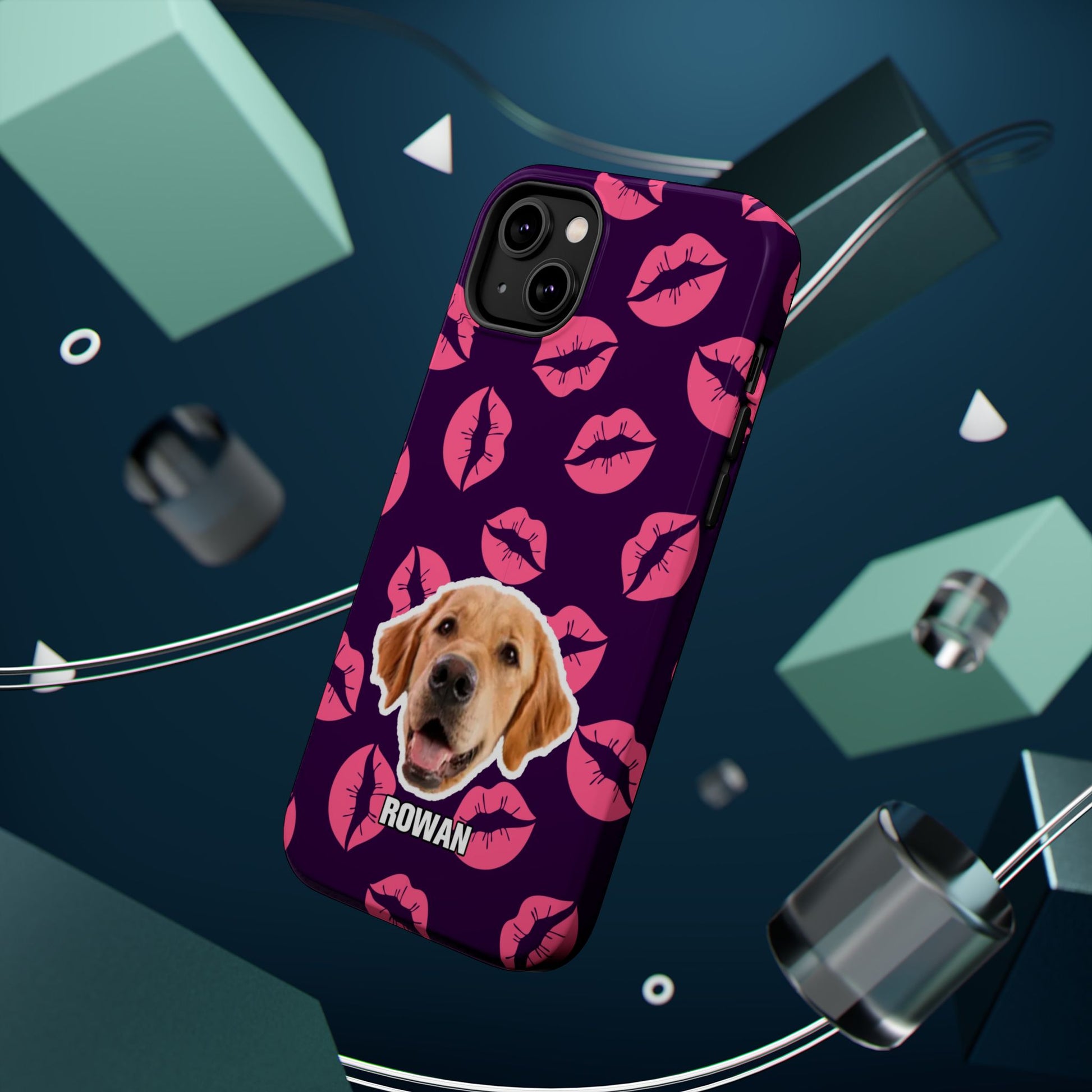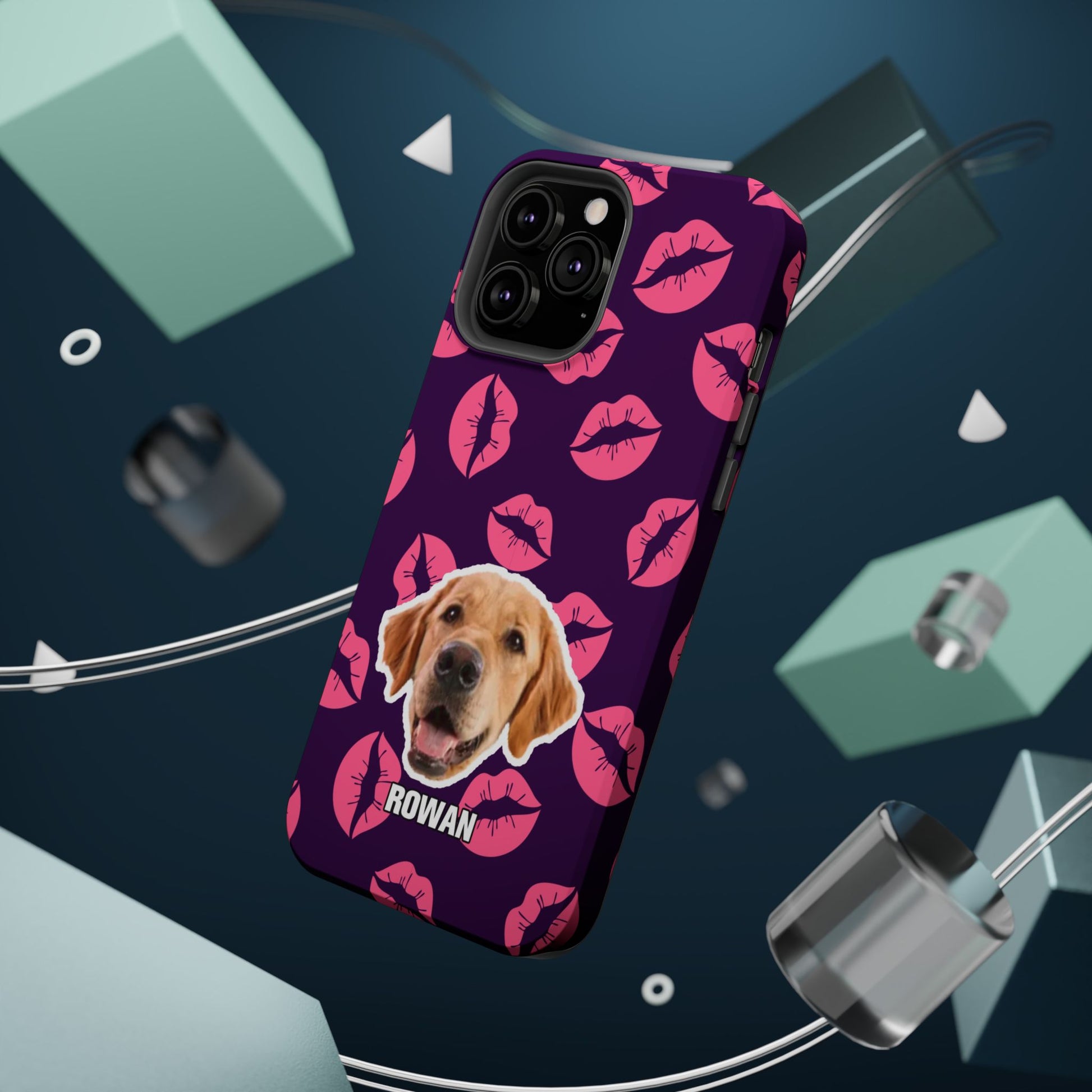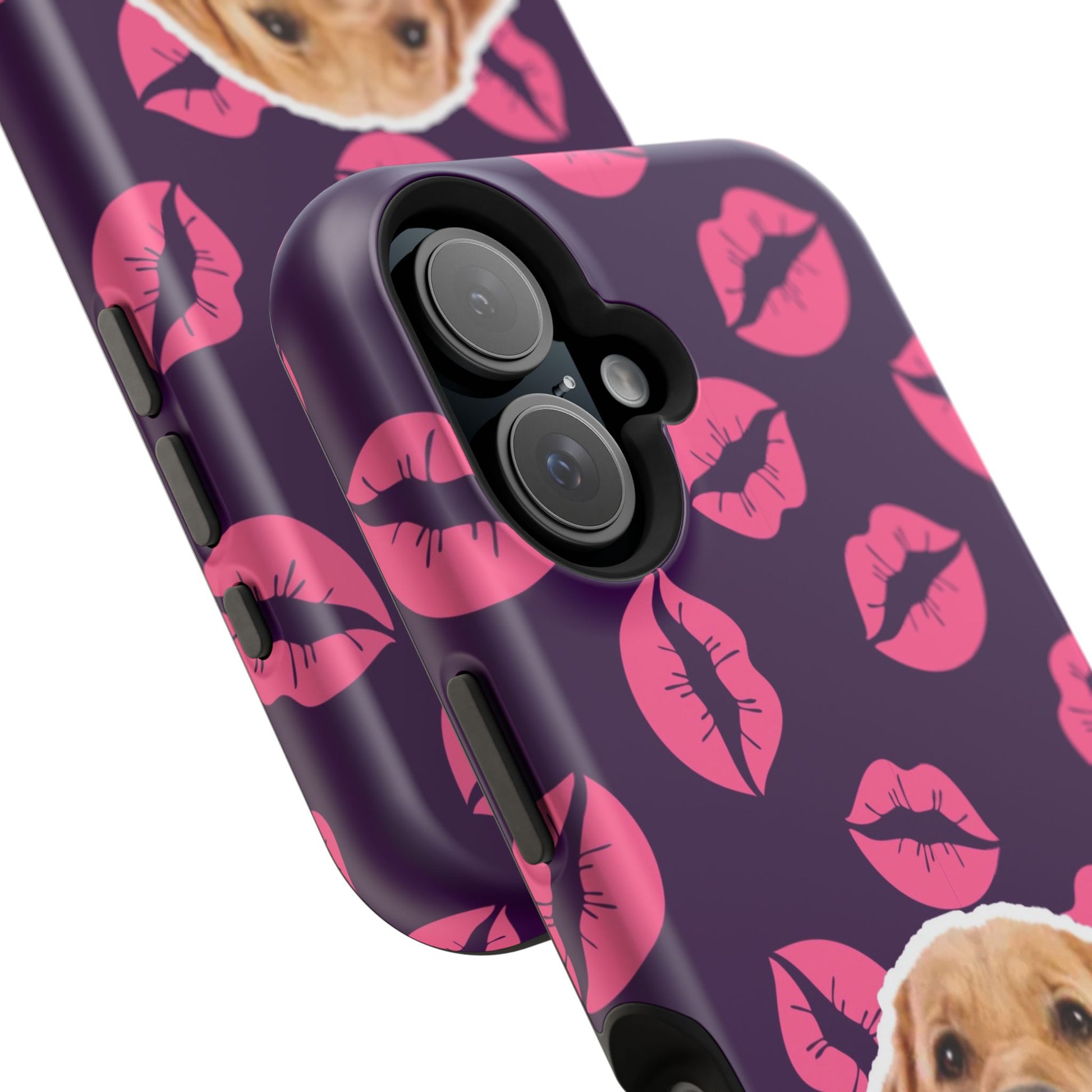 Bright, playful phone protection designed to spotlight a beloved pup and a bold pattern. This impact-resistant case wraps your device in a full-color print of magenta kiss marks against a deep plum background, with a cheerful dog portrait and name plate centered at the bottom. The dual-layer construction—rigid polycarbonate shell with a cushioned TPU liner—keeps the edges and back shielded from scratches and everyday knocks. Choose glossy for a vivid shine or matte for a smooth, subtle finish. Lightweight and tactile, it slips into life seamlessly: coffee runs, walks in the park, or cozy nights at home when you want your phone to feel personal and fun.
