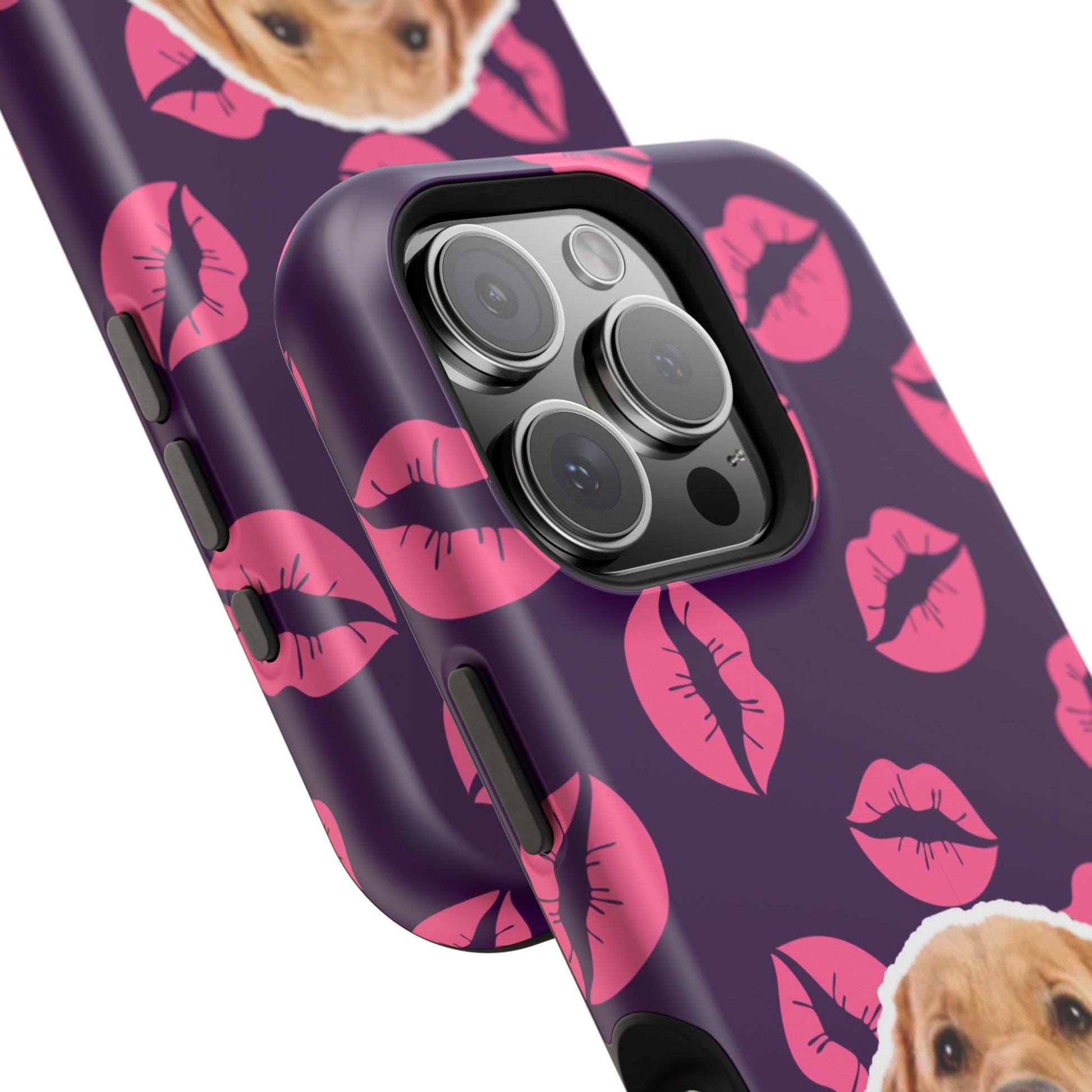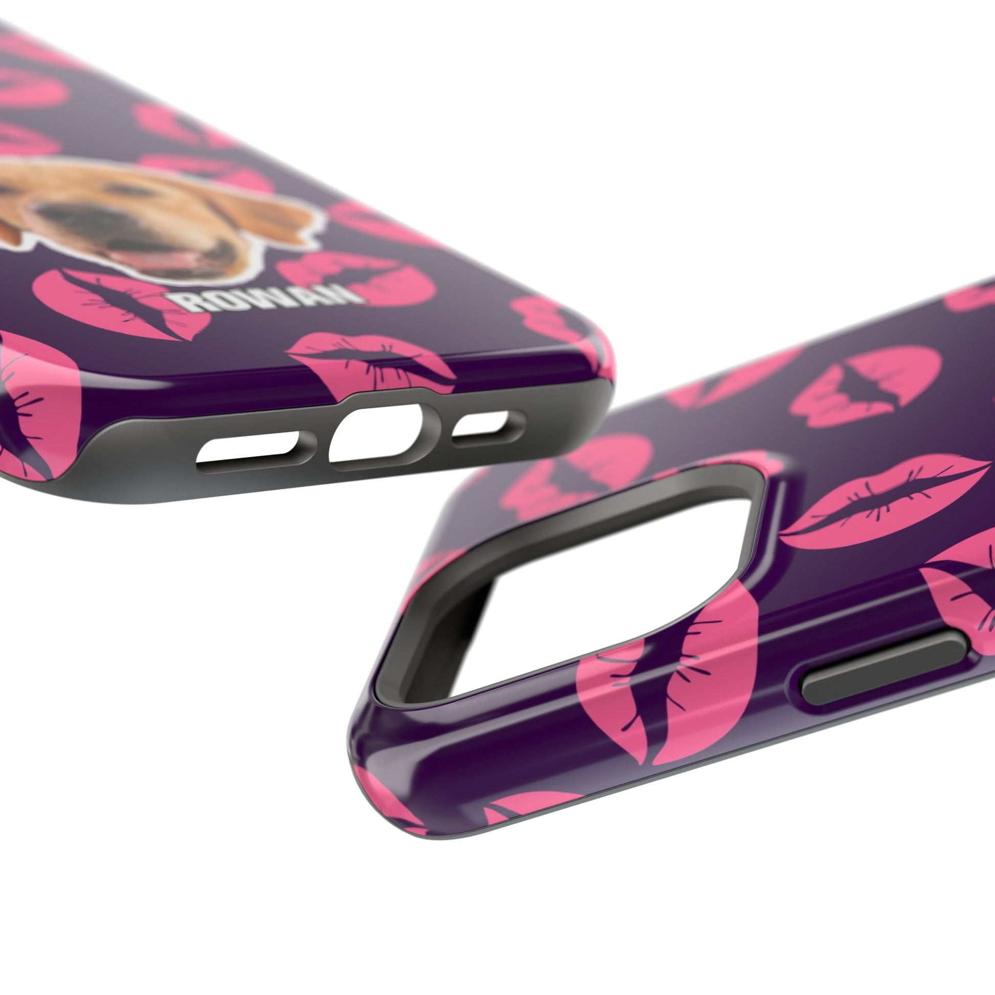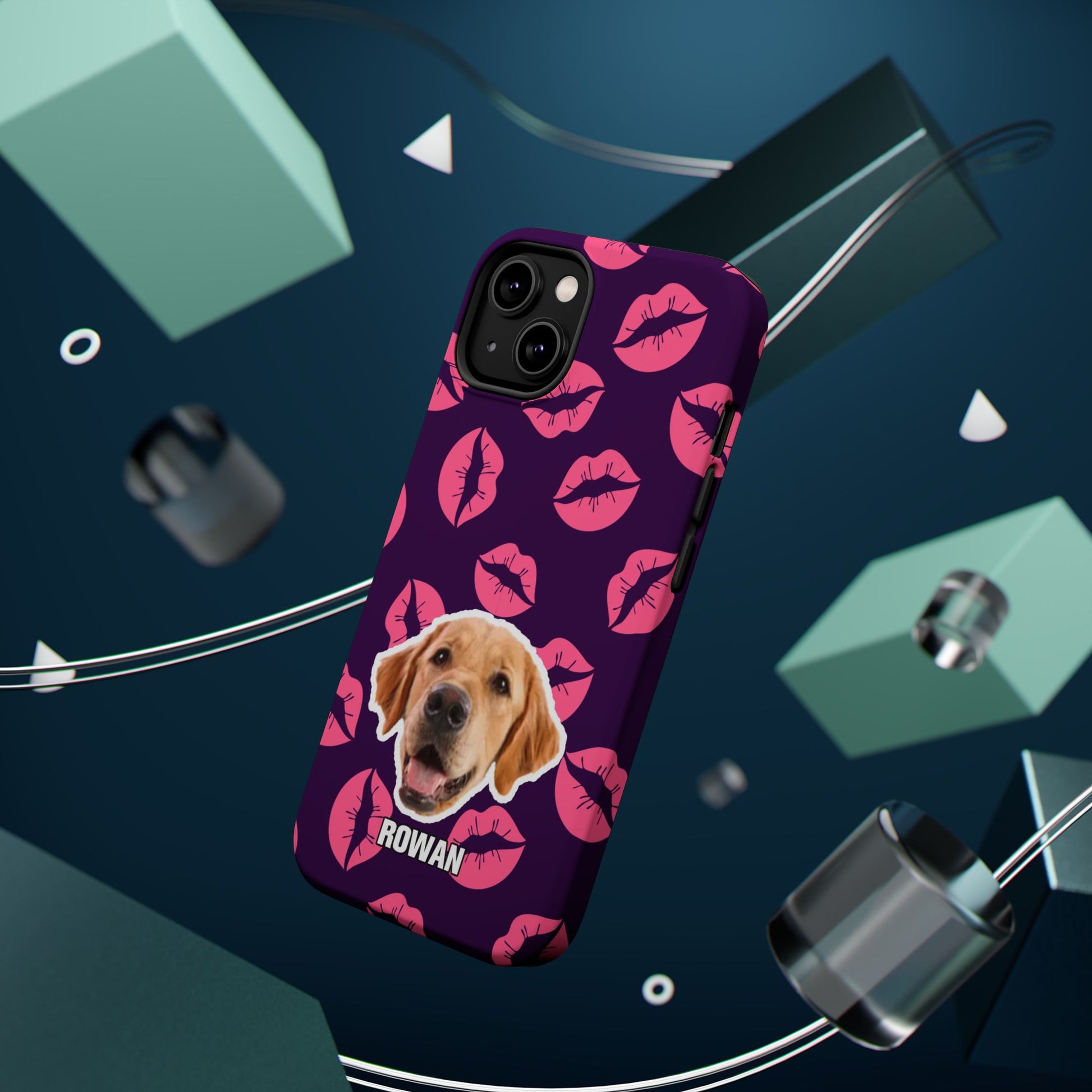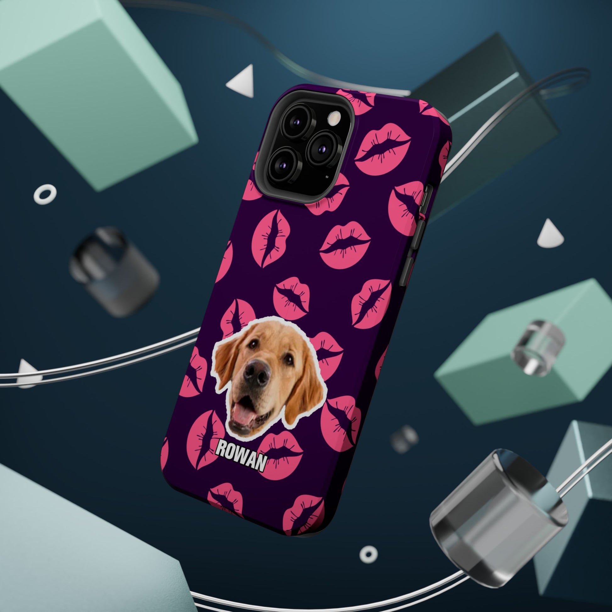 Bright, playful phone protection designed to spotlight a beloved pup and a bold pattern. This impact-resistant case wraps your device in a full-color print of magenta kiss marks against a deep plum background, with a cheerful dog portrait and name plate centered at the bottom. The dual-layer construction—rigid polycarbonate shell with a cushioned TPU liner—keeps the edges and back shielded from scratches and everyday knocks. Choose glossy for a vivid shine or matte for a smooth, subtle finish. Lightweight and tactile, it slips into life seamlessly: coffee runs, walks in the park, or cozy nights at home when you want your phone to feel personal and fun.