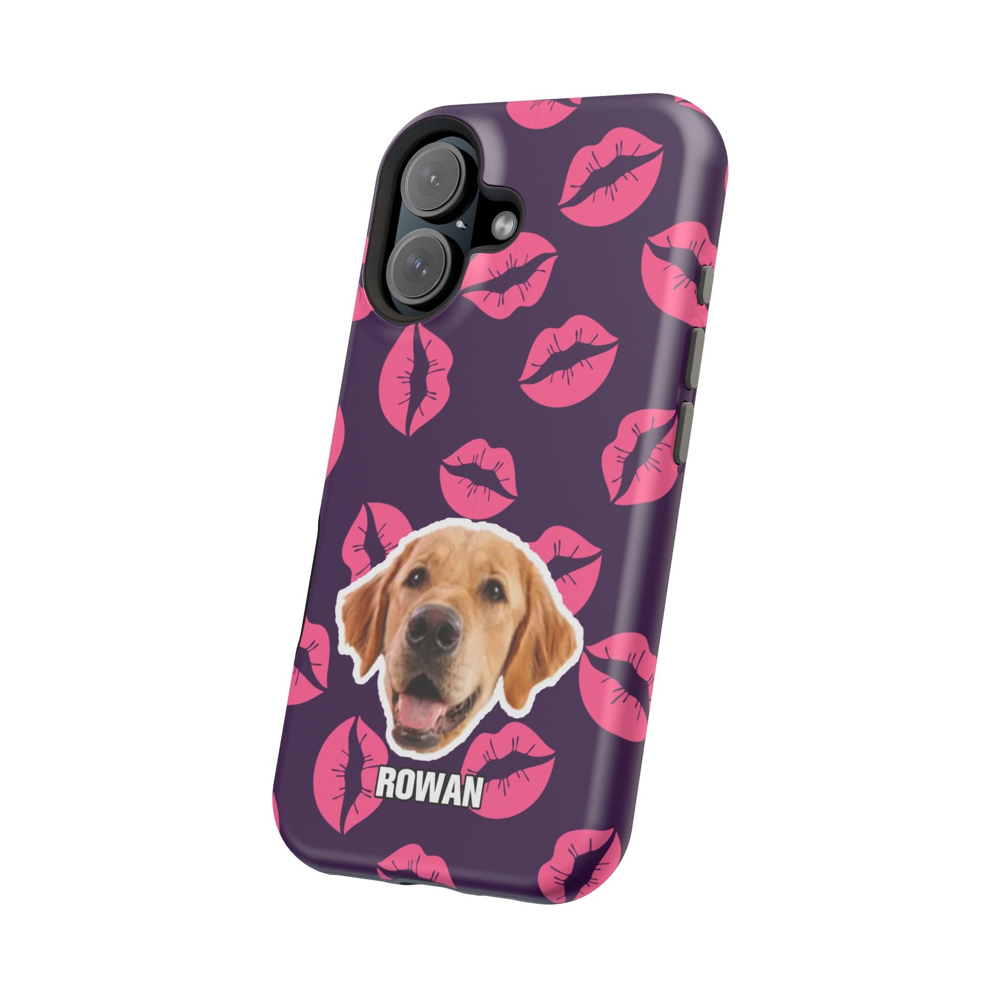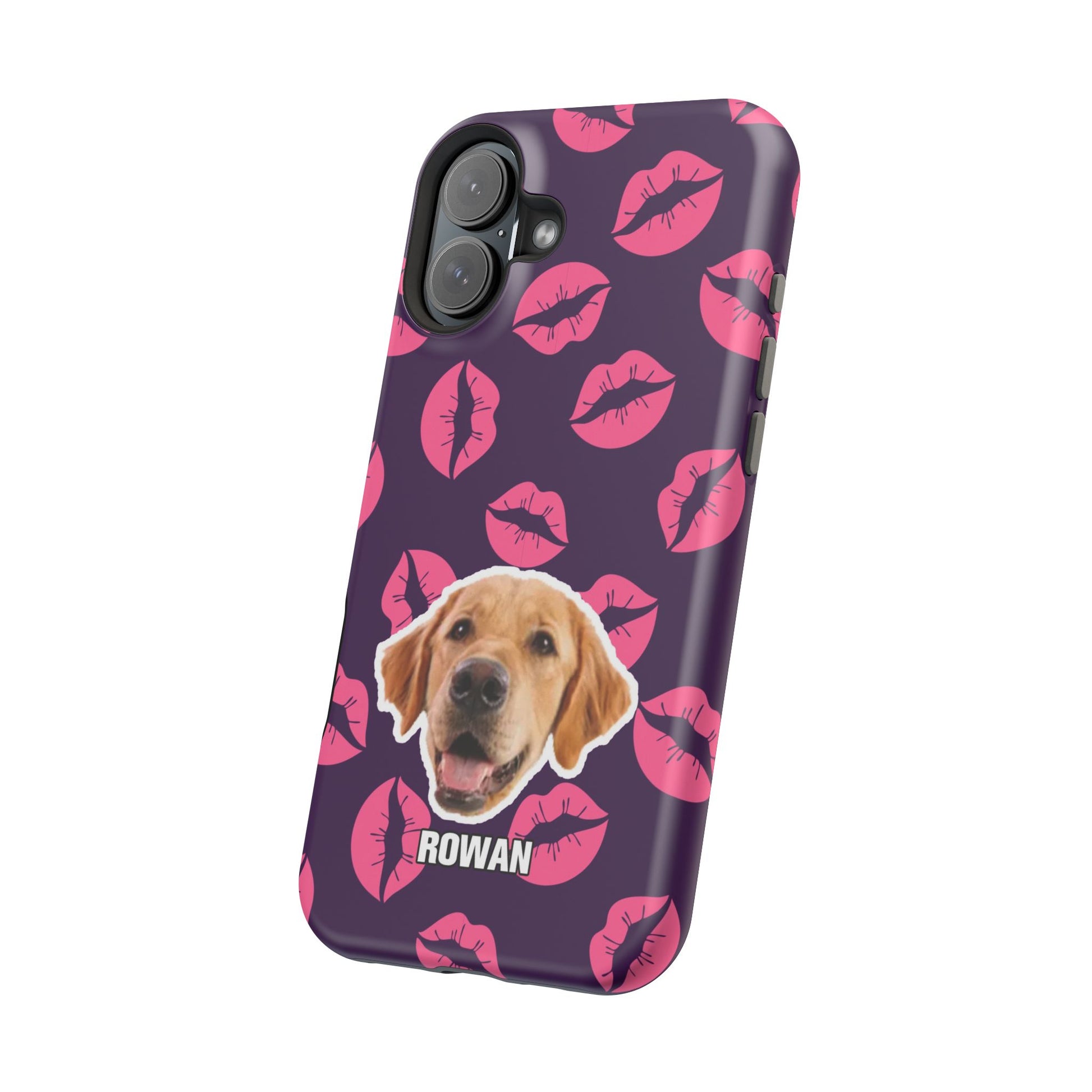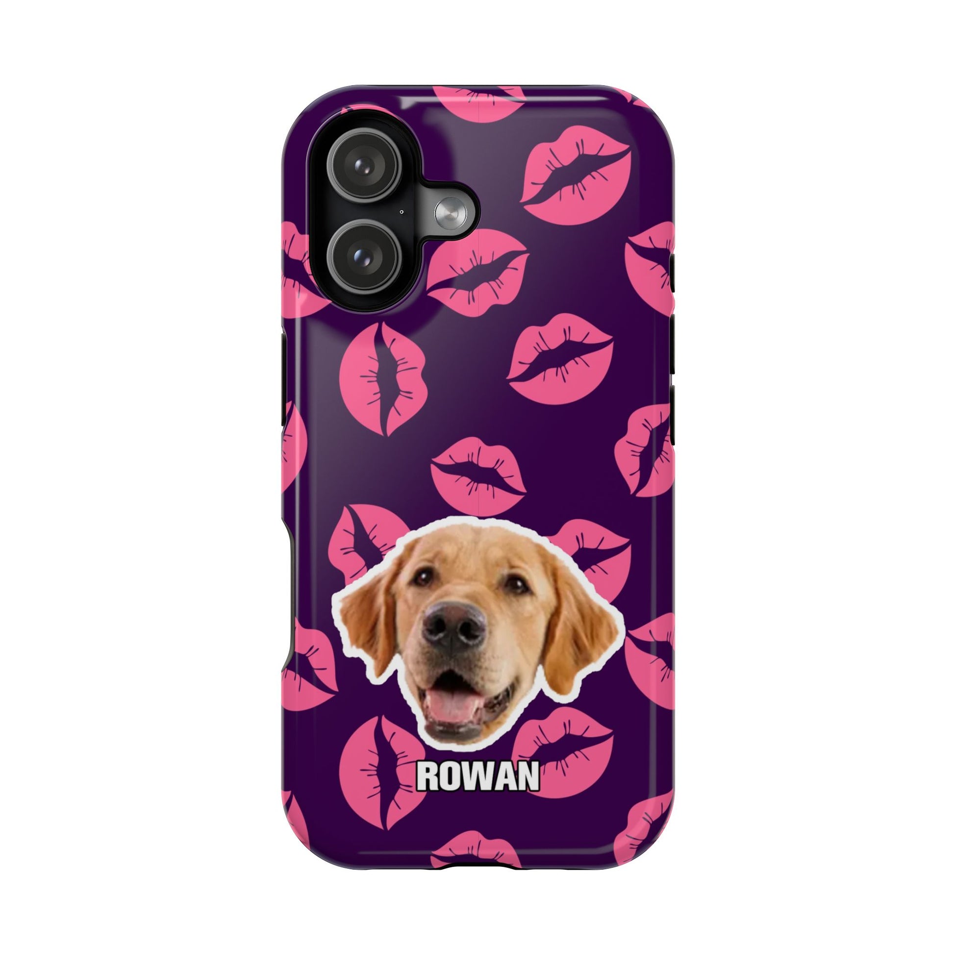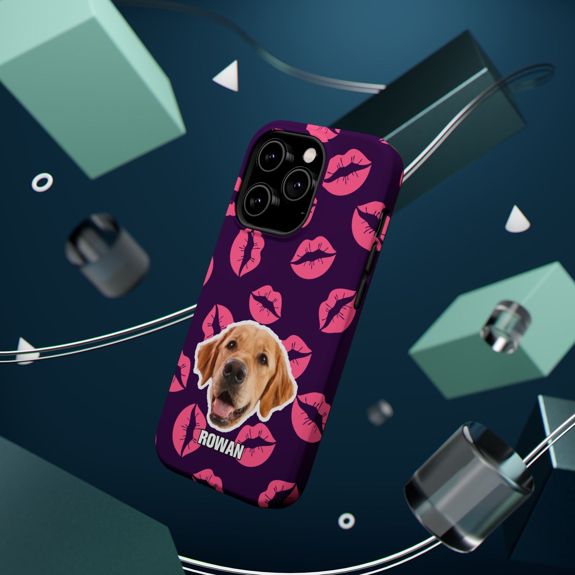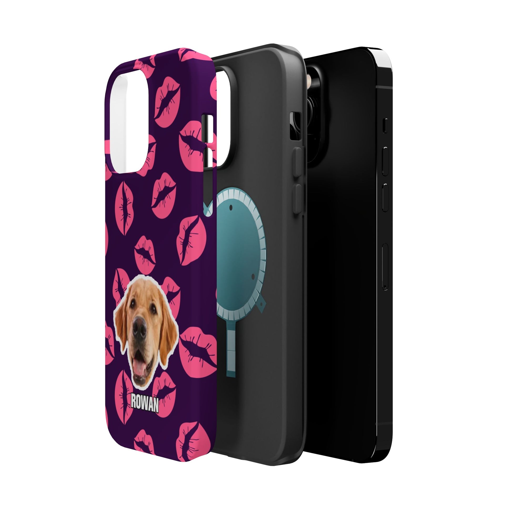 Bright, playful phone protection designed to spotlight a beloved pup and a bold pattern. This impact-resistant case wraps your device in a full-color print of magenta kiss marks against a deep plum background, with a cheerful dog portrait and name plate centered at the bottom. The dual-layer construction—rigid polycarbonate shell with a cushioned TPU liner—keeps the edges and back shielded from scratches and everyday knocks. Choose glossy for a vivid shine or matte for a smooth, subtle finish. Lightweight and tactile, it slips into life seamlessly: coffee runs, walks in the park, or cozy nights at home when you want your phone to feel personal and fun.