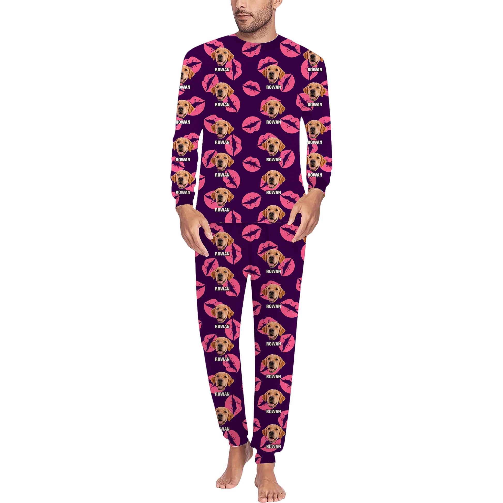 Soft, playful pajamas made for lounging and laughter. A cozy two-piece set in lightweight, quick-drying polyester, printed all over with a joyful pattern of a golden retriever’s face and bright kiss marks on a deep purple field. The relaxed top and matching elastic-waist trousers move with you through slow mornings, movie nights, and weekend naps. This set feels casual and fun — the kind of sleepwear that sparks smiles and becomes part of quiet routines and silly sleepover stories.